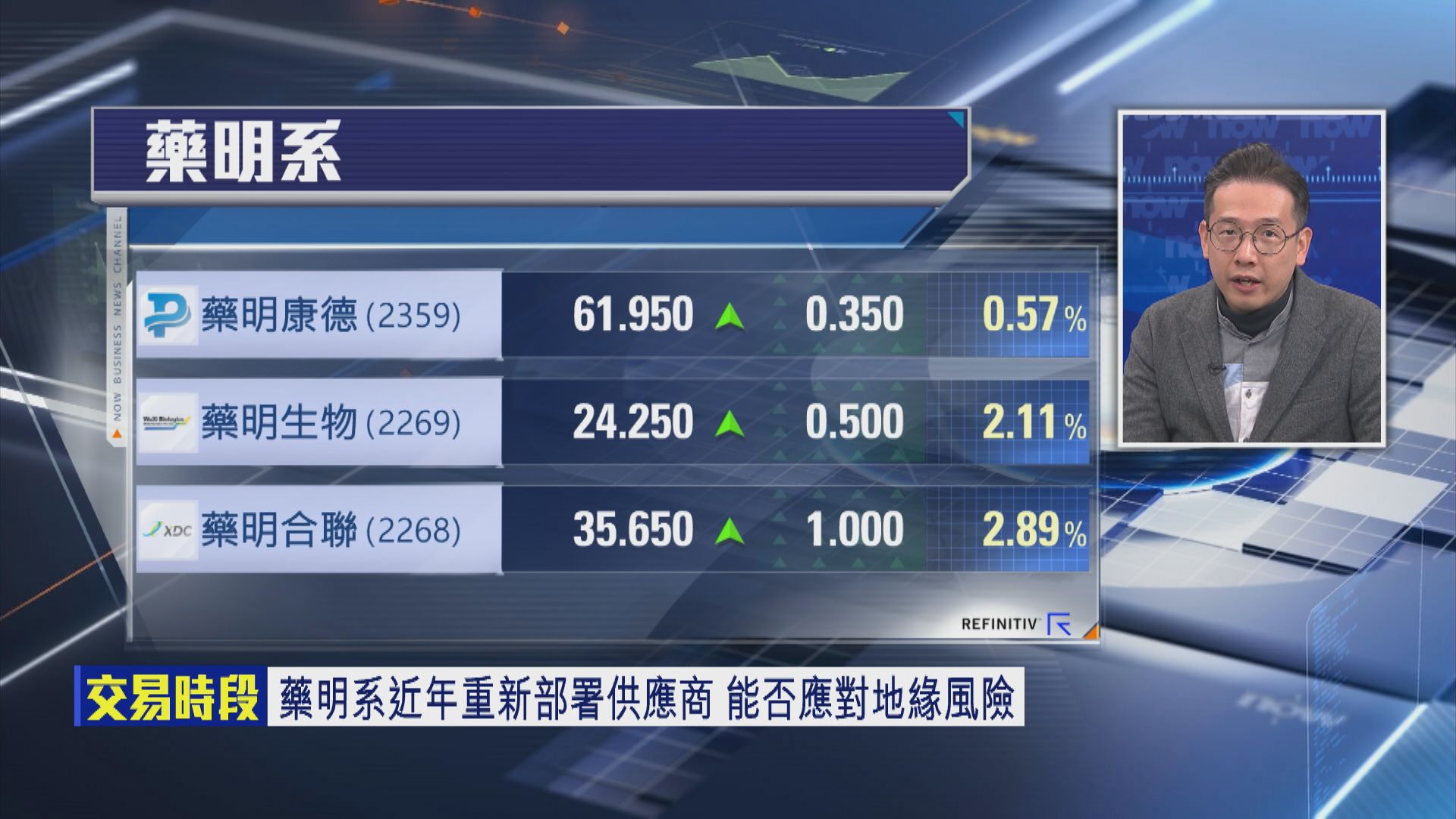 佢又話,雖然地緣政治因素略為紓緩,但仲未真正解決,所以要留意美國總統特朗普(Donald Trump)嘅政策,因為隨時對藥明系有重大影響。