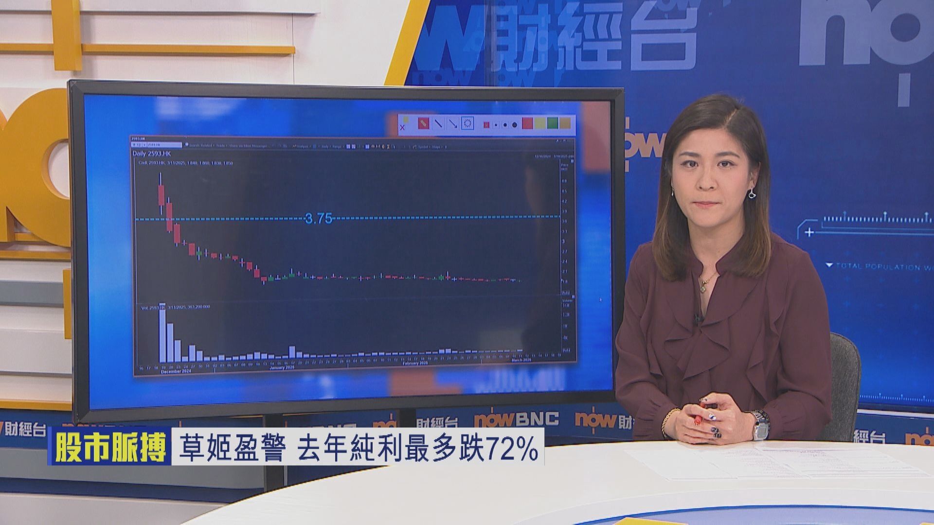 【Now財經台】上市唔夠3個月嘅草姬集團(02593)昨晚(10日)發盈警,預期去年少賺逾67%,股價今朝(11日)創咗上市新低1.83元,跌2.6%,最終以接近全日低位市,報1.85元,跌1.5%。