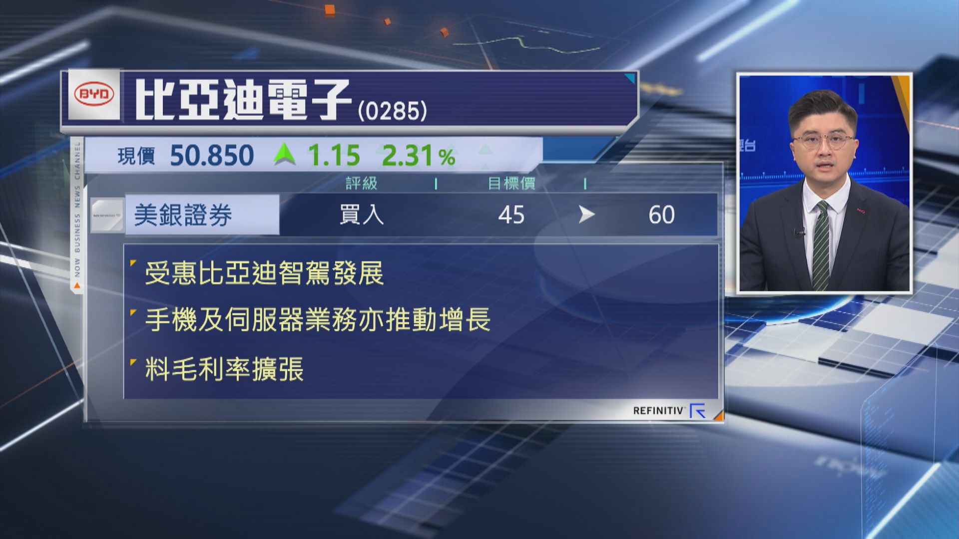 【Now財經台】美銀證券升比亞迪電子(00285)目標價。