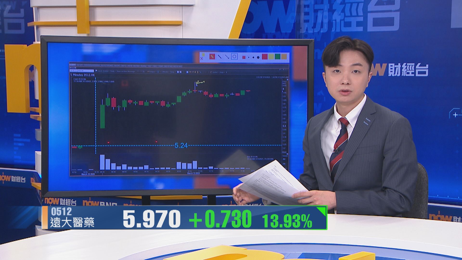 【Now財經台】遠大醫藥(00512)昨晚(12日)出咗業績,股價今日(13日)顯著上升,高開4%後,升幅一度擴大至逾16%,高見6.09元,衝上逾兩年高位,成交股數較過去100日同時段平均激增25倍,成交金額罕有逾2億元。