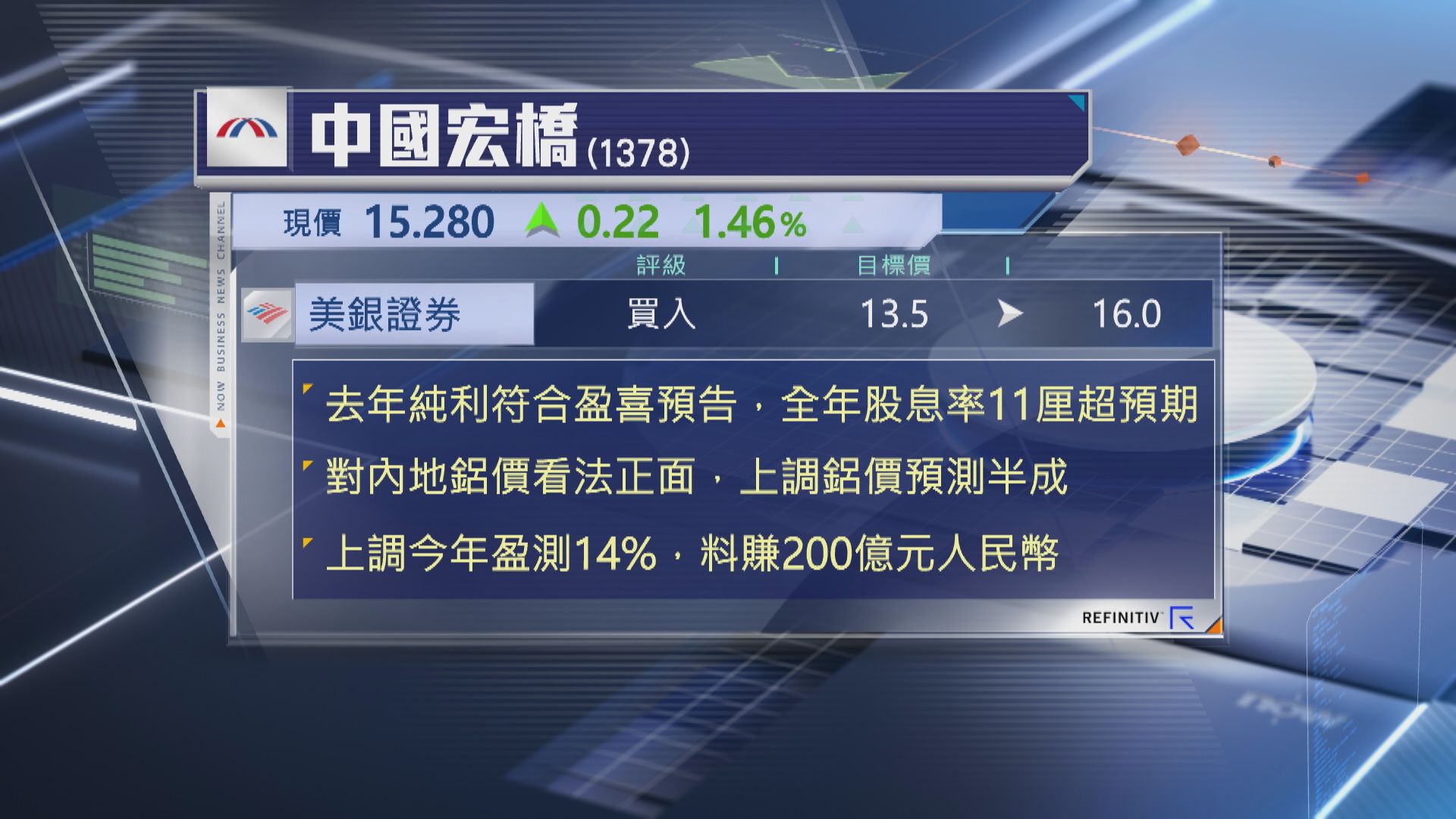 宏橋去年多賺95%至223.72億元人民幣,美銀指符合盈喜預告,估計去年第4季純利按季增長25%至73億元人民幣,全年派息比率由47%升至63%,相當於股息率11厘,超預期。