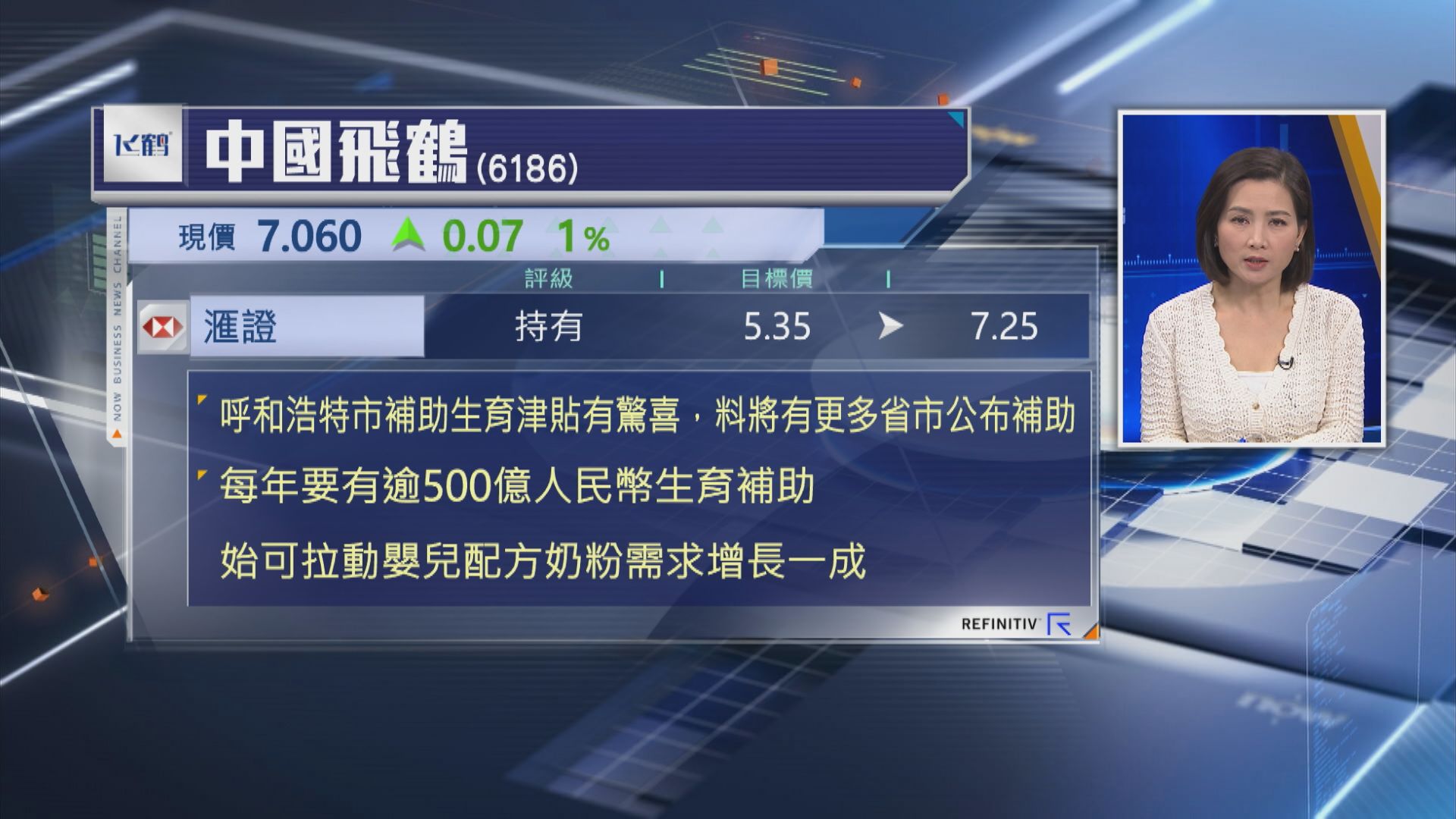 滙證相信,中央明確支持消費後,陸續有更多省市公布生育補助計劃,據國家衞生健康委員會2023年及去年底數據顯示,全國有23個省提供生育補助,認為嬰兒配方奶粉可直接受惠於補貼生育政策,但要扭轉低生育率仍是一個艱巨任務,估計每年最少要有500億元人民幣或以上補貼,才可帶動嬰兒配方奶粉需求增長10%,重申「持有」評級,但上調目標價至7.25元。