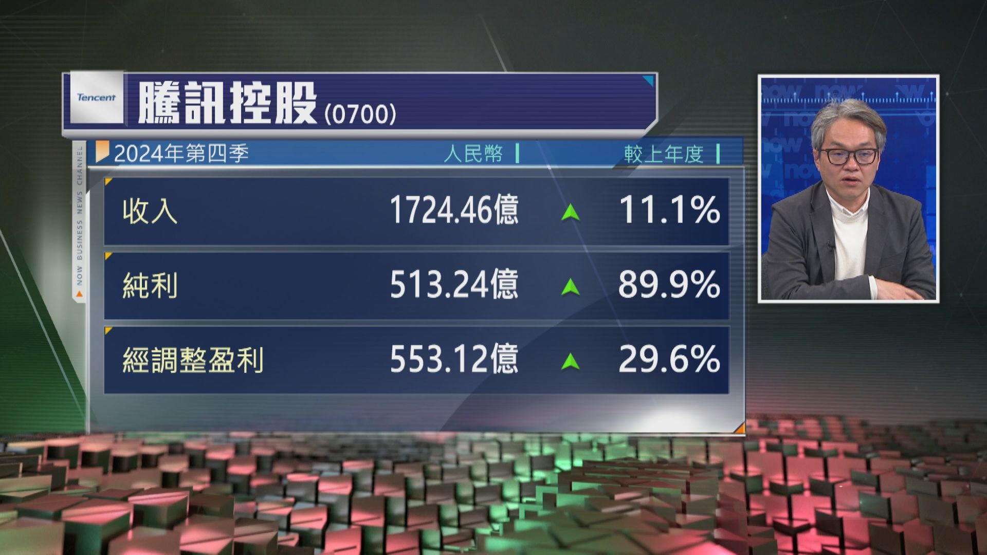 【Now財經台】騰訊控股(00700)去年第四季收入升11.1%,經調整盈利升29.6%。