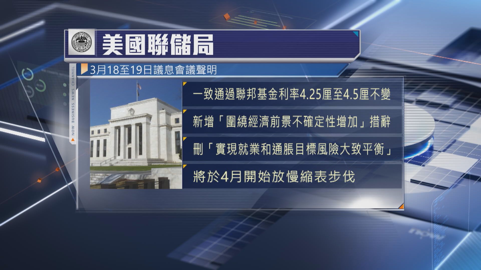聯儲局議息後宣布,一致通過維持聯邦基金利率於4.25厘至4.5厘不變,符預期,連續第2次會議按兵不動,議息聲明新增「圍繞經濟前景的不確定性增加」的措辭,並刪除「實現就業及通脹目標的風險大致平衡」的字眼。
