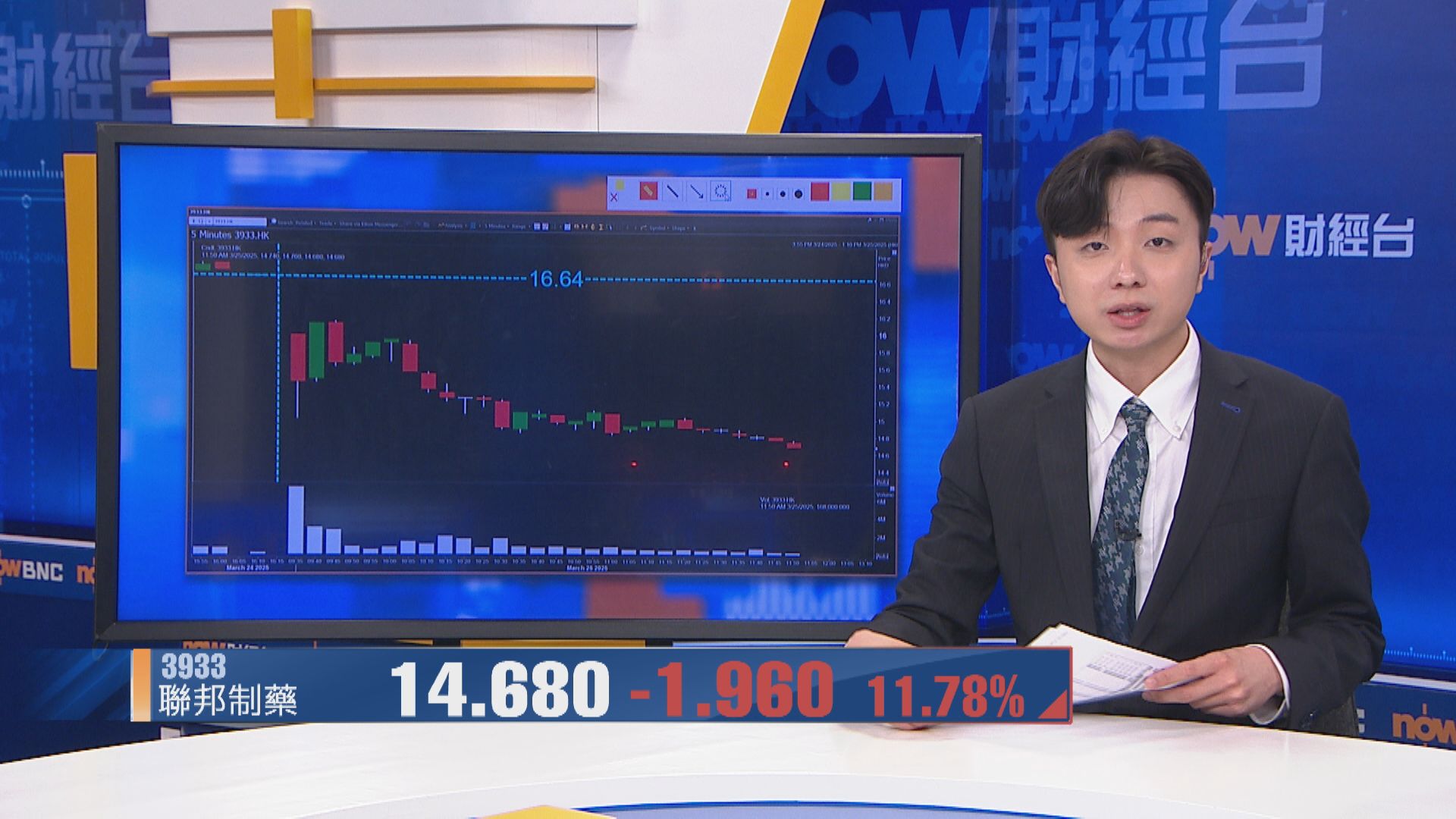 【Now財經台】聯邦制藥(03933)今早(25日)低開4%後,跟隨大市跌幅擴大,一度大跌12%,低見14.62元,成交較過去100日同時段平均大增12倍,暫時成交金額近5億元。
