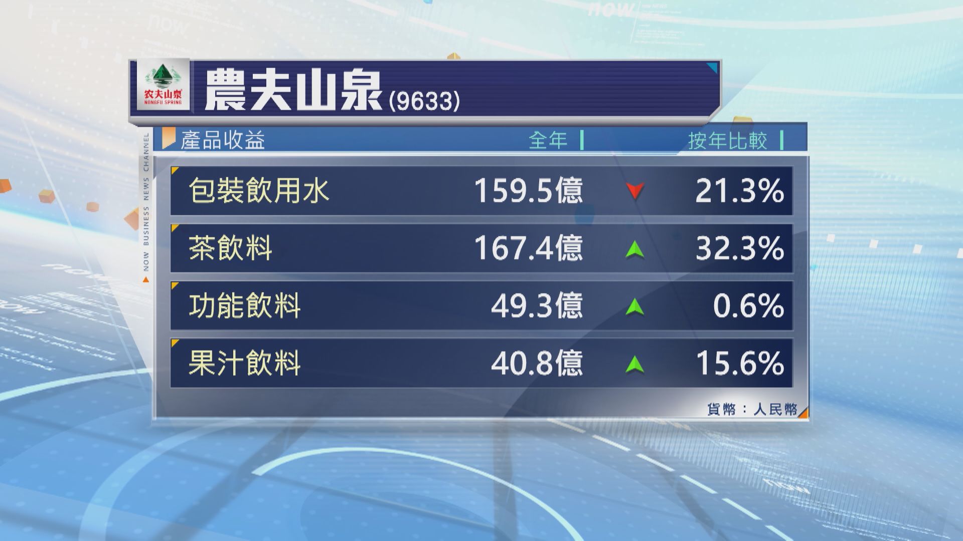 按產品類別劃分,包裝飲用水去年收益按年跌21%,茶飲類產品收益按年增長32%。