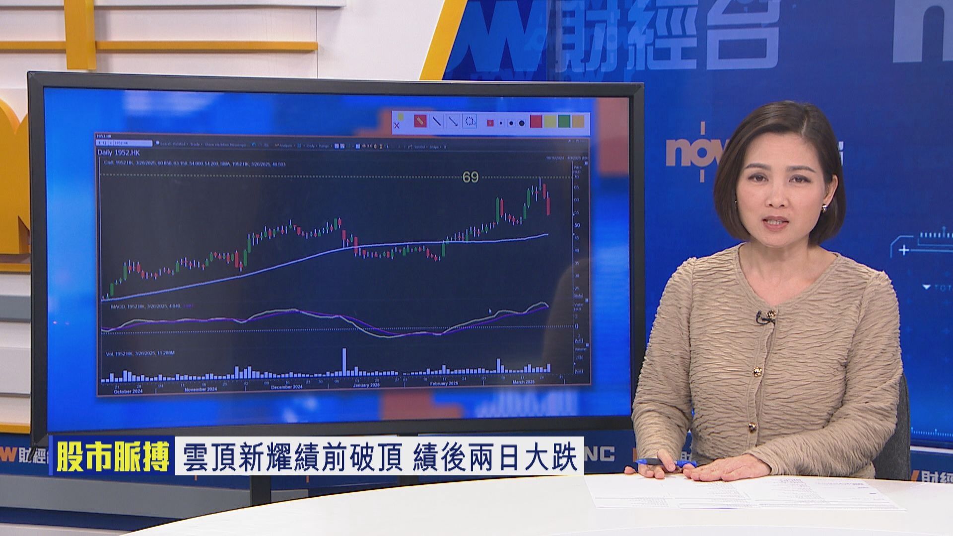 【Now財經台】B仔股雲頂新耀(01952)昨日(25日)開市前出咗業績,股價喺放榜前曾破頂,衝上逾兩年半高位,但業績一出就見光死,股價就連跌兩日,繼昨日收市跌4%後,今日(26日)再大跌11%,最終以接近全日低位收市,收報54.2元。
