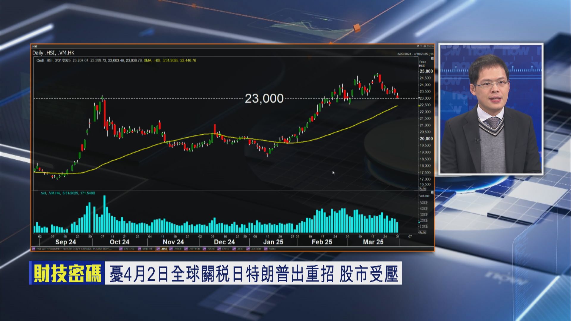 【Now財經台】今日(31日)為3月最後一個交易日,區內股市跟隨美股大跌,港股算「跌得少」,市場普遍等待美國總統特朗普(Donald Trump)「對等關稅」(Reciprocal Tariffs)出台。