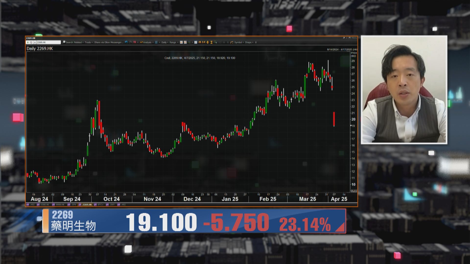 美國宣布對華進口貨品加徵10%關稅,中國隨即實行多項反制措施,恒生指數今日(7日)急挫逾10%,藍籌股幾乎全線向下,而今次貿易戰未有捲入行業關稅的藥品股,今日亦受牽連,股價一度大跌逾22%,不過,正因為藥明未有捲入關稅的風眼,今年股價累計升幅仍相當顯著,升逾40%,現時是否部署藥品股的好時機?