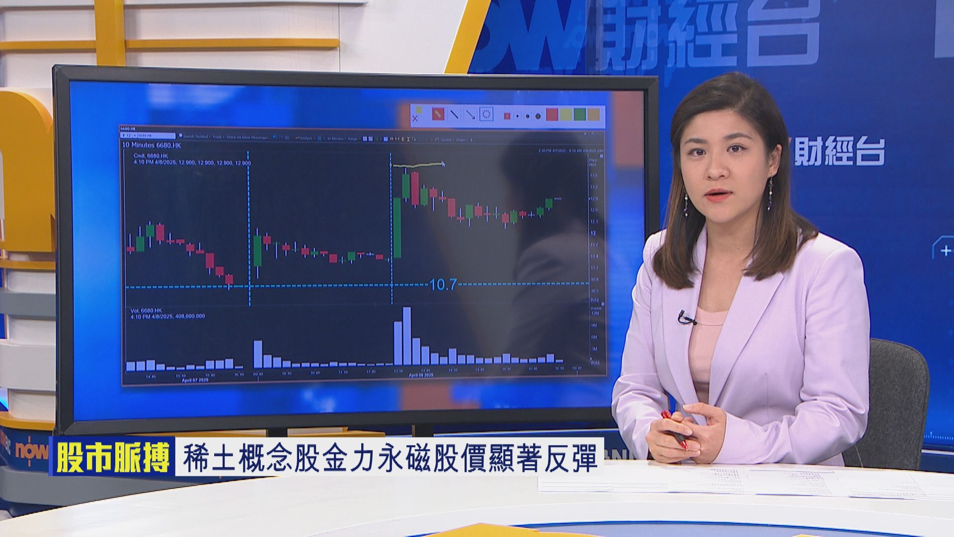 【Now財經台】稀土概念股金力永磁(06680)今日(8日)股價高開4%,之後發力,一度升約28%,高位見13.68元,收市升幅仍有20%,報12.9元。成交股數較過去100日同時段增加約5倍。