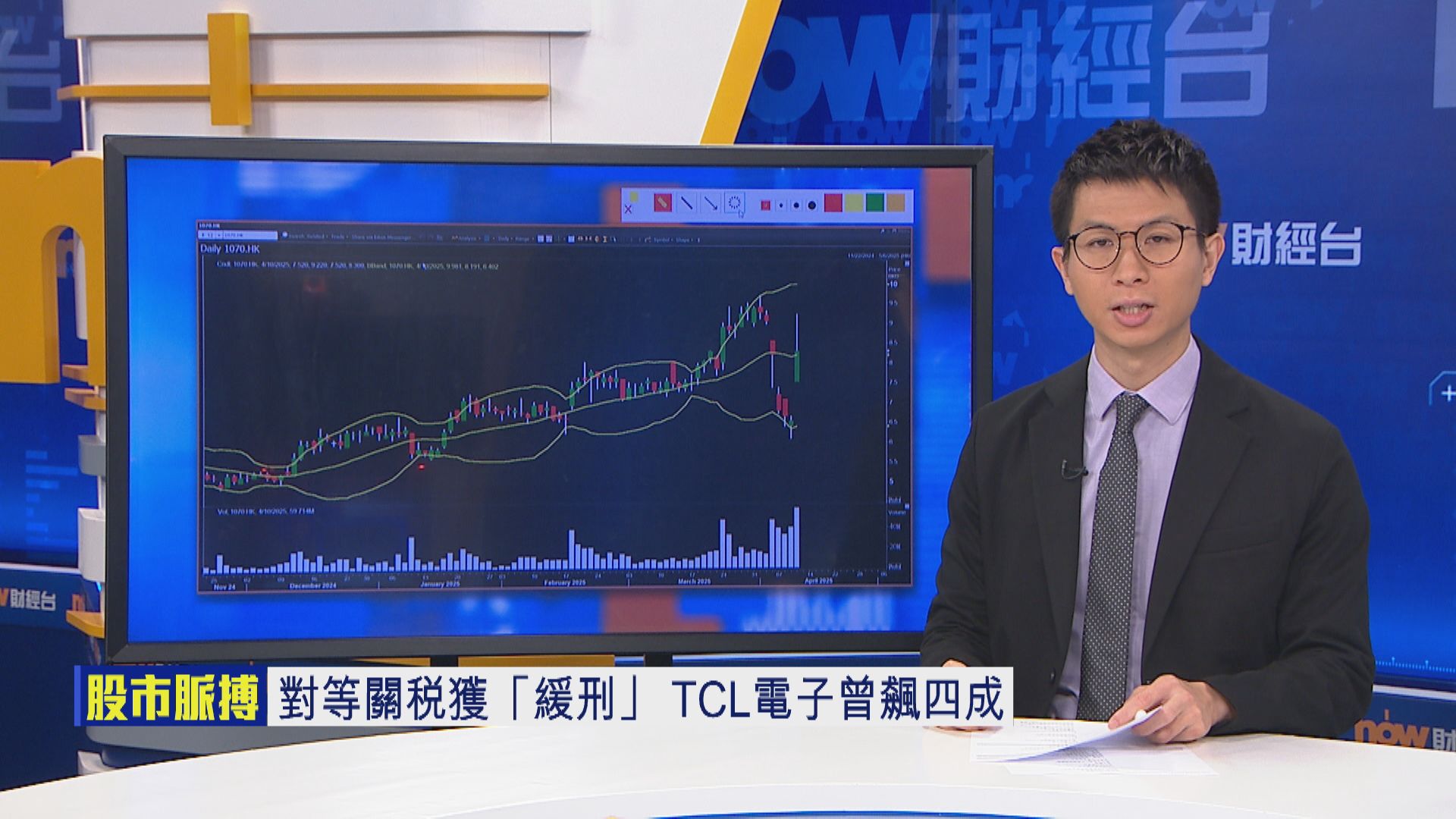 【Now財經台】美國總統特朗普(Donald Trump)暫緩中國以外國家或地區的「對等關稅」(Reciprocal Tariff)90日,於越南設有生產線電視製造商TCL電子集團(01070)今日(10日)都因而受惠,股價反彈,裂口高開逾14%,一度高見9.22元,升逾40%,成交金額急升至約5億元,成交股數比過去100日同時段平均大增8倍。