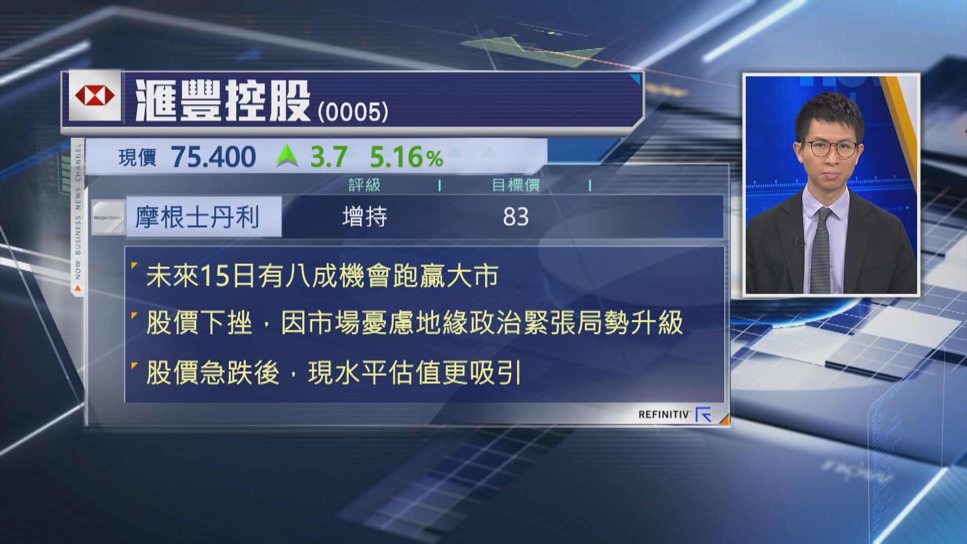 截至昨日(10日)為止,滙控於過去4個交易日股價累跌超過10%。大摩指滙控近日股價急跌,主要是反映市場憂慮,地緣政治緊張局勢升級,不過股價急跌後,短線估值水平較前吸引,維持滙控「增持」評級及目標價83元不變。