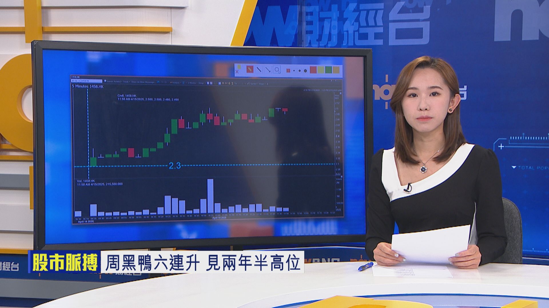 【Now財經台】內地滷製品商周黑鴨(01458)股價已連升6個交易日,今日(15日)平開後隨即向上,並愈升愈有,衝上兩年半高位,一度高見2.48元,大升近8%,成交股數已多過昨日(14日),暫時成交金額逾3000萬元。
