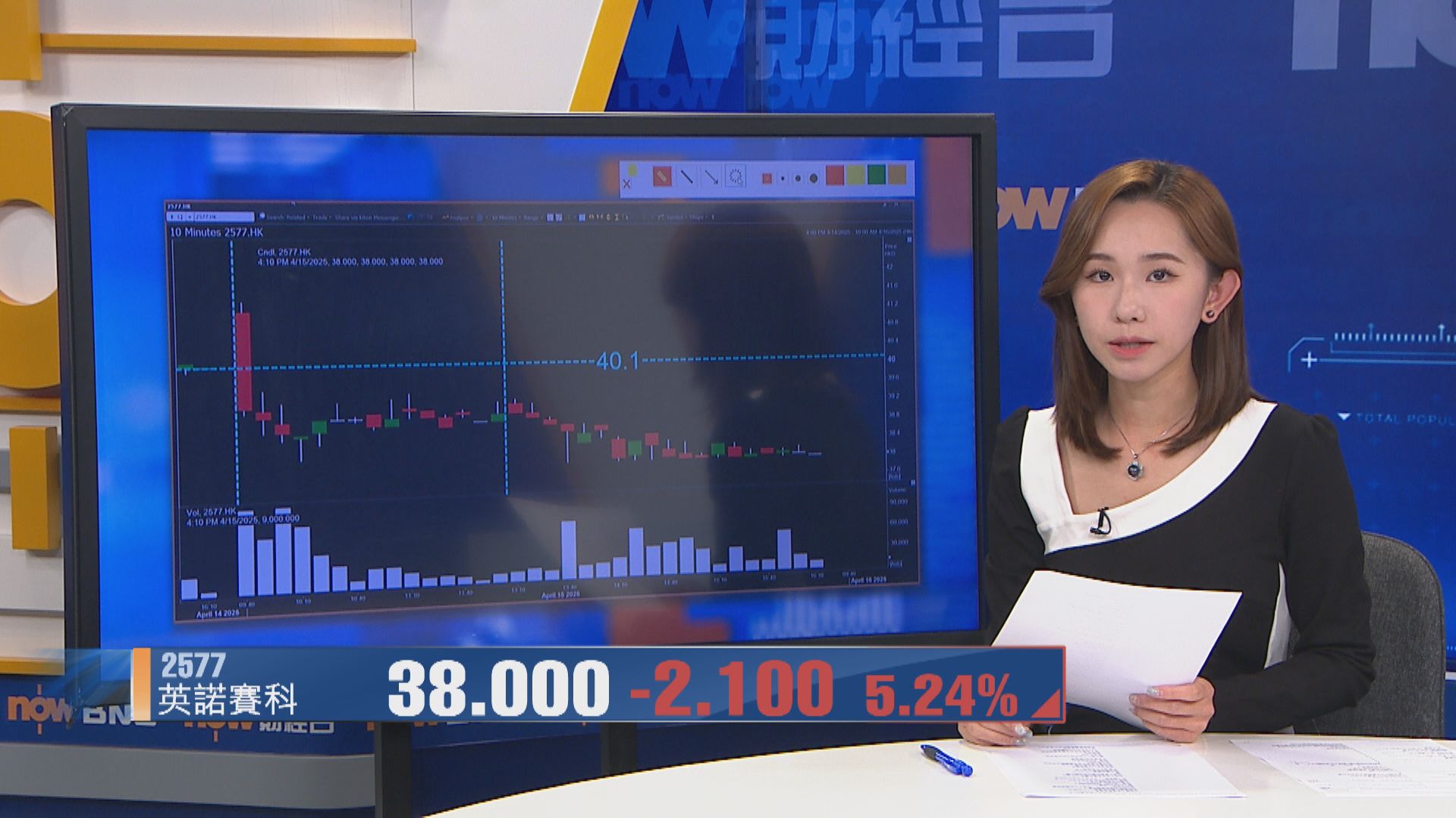 【Now財經台】半新股英諾賽科(02577)主要研製氮化鎵產品,股價今早(15日)高開逾2%後,好快就掉頭向下,仲愈跌愈多,收市跌逾5%,以全日低位38元收市,成交股數較過去100日同時段平均增70%。