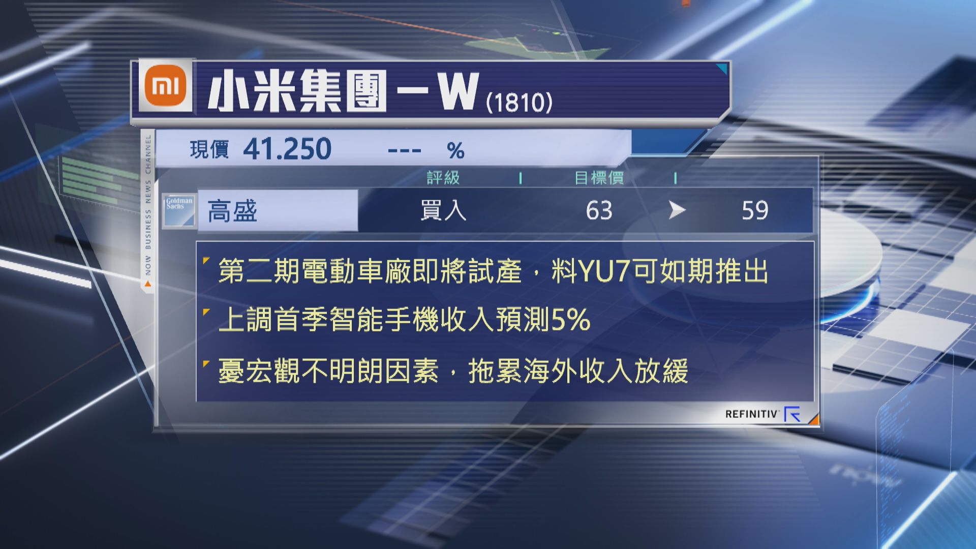 該行指出,主要反映憂慮宏觀經濟不明朗會拖累集團海外收入放緩。不過,高盛仍對小米經營狀況保持正面,由於小米第2期電動車廠近期已收到監管部門許可,快將試產,相信小米YU7可如期於6月至7月推出。