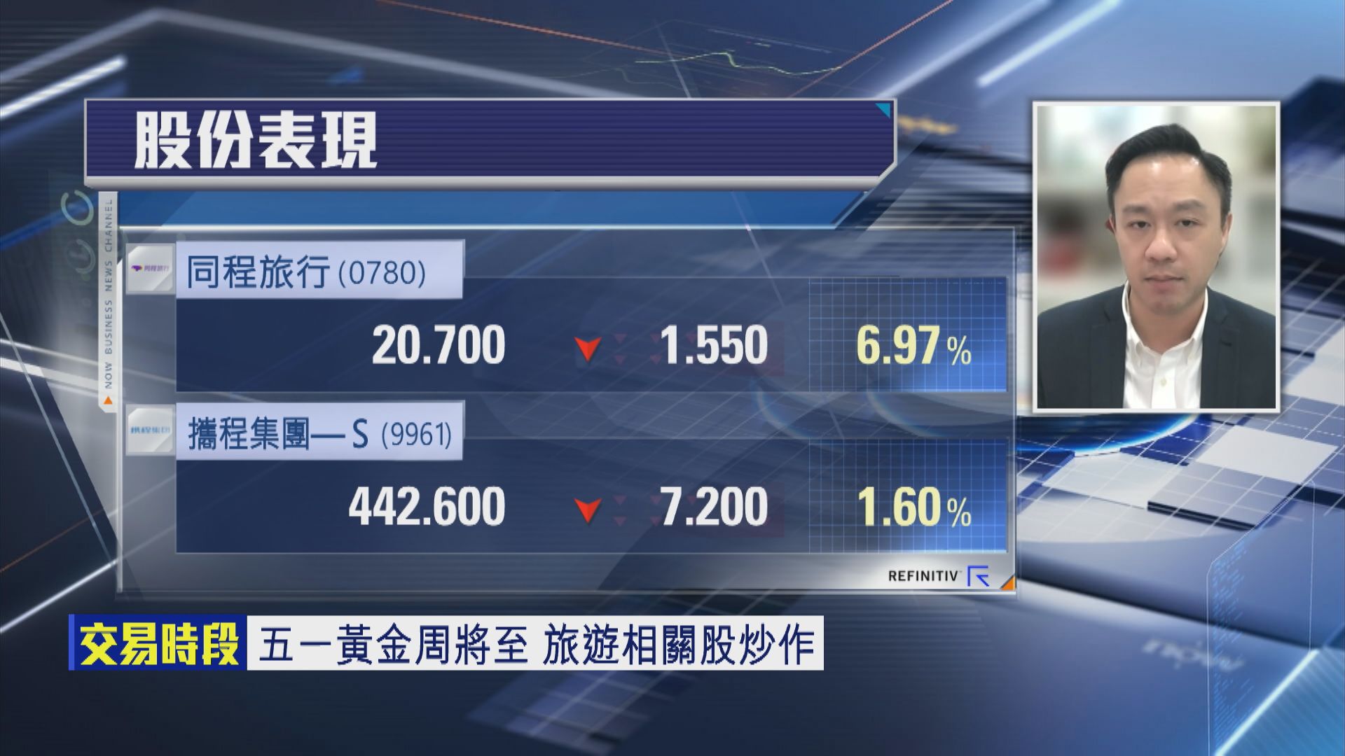 【Now財經台】同程旅行(00780)股價今年以嚟暫時累升唔夠20%,下星期就係「五一黃金周」,旅遊股有冇得炒?同程股價今日(22日)向下,一度低見19.56元,重挫12%,之後跌幅收窄,值唔值得趁低吸納?