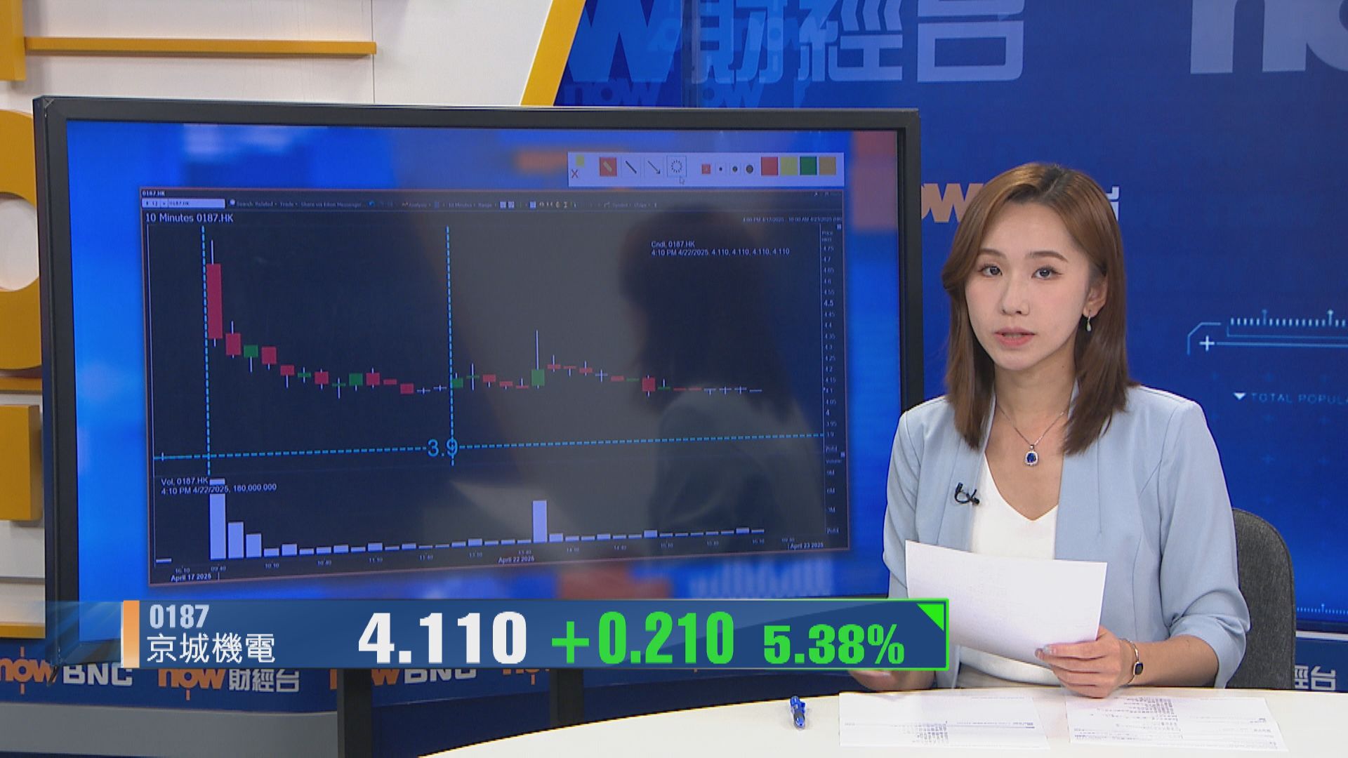 【Now財經台】京城機電股份(00187)股價今早(22日)大幅高開近15%後,一度高見4.8元,勁升23%,但其後升勢無以為繼,收市僅升逾5%,報4.11元,成交股數較過去100日同時段平均增2倍,全日成交金額1.79億元。