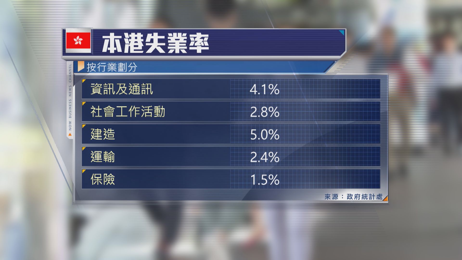 按行業劃分,資訊及通訊業、社會工作活動業,以及建造業失業率升幅相對顯著,運輸及保險業失業率則回落。
