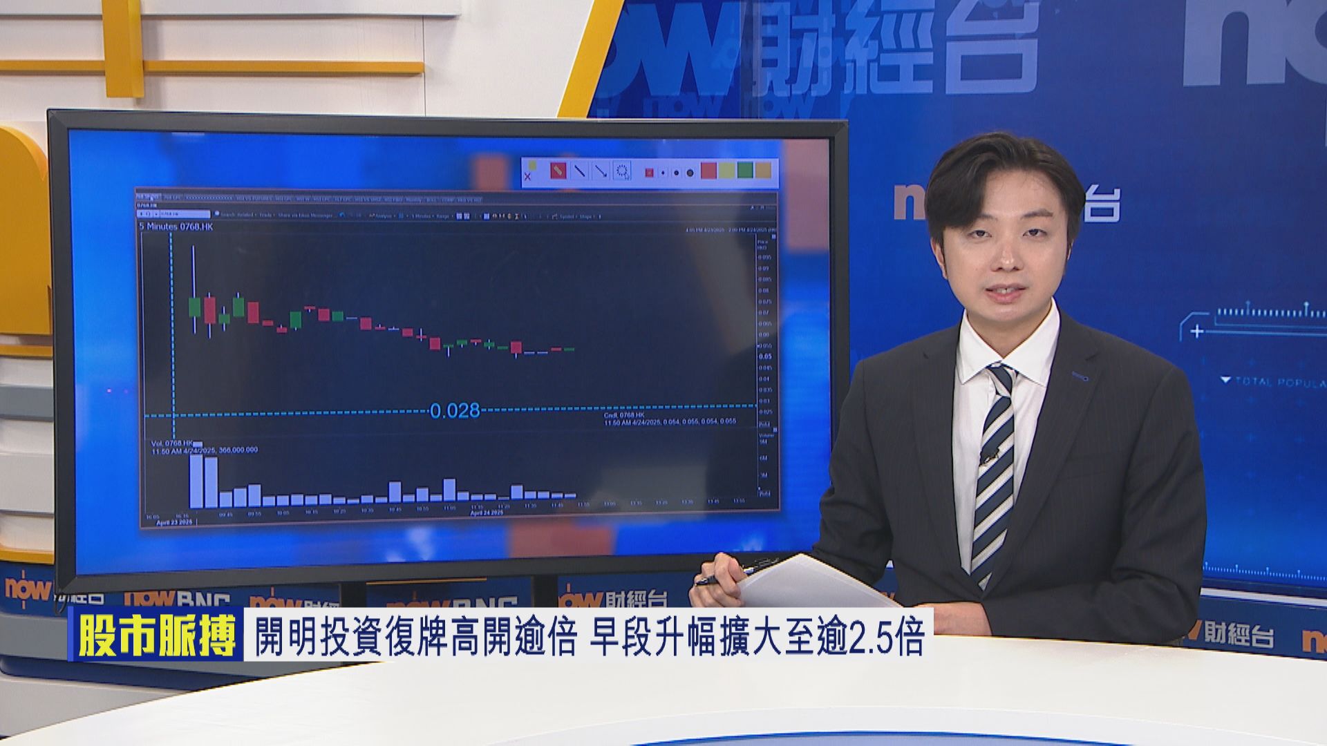 【Now財經台】開明投資(00768)股價今日(24日)大幅高開逾1倍後,升幅一度擴大至逾2.5倍,高見0.1元,其後升幅收窄,成交股數較過去100日平均激增2000倍。