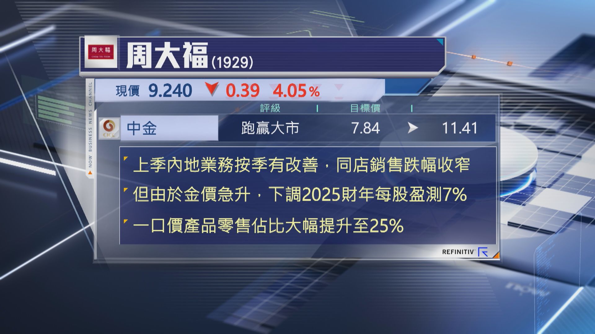 【Now財經台】中金公司大幅上調周大福(01929)目標價45%,由7.84元調高至11.41元,該行預期,行業銷售好轉有助提升周大福估值,評級「跑贏大市」。