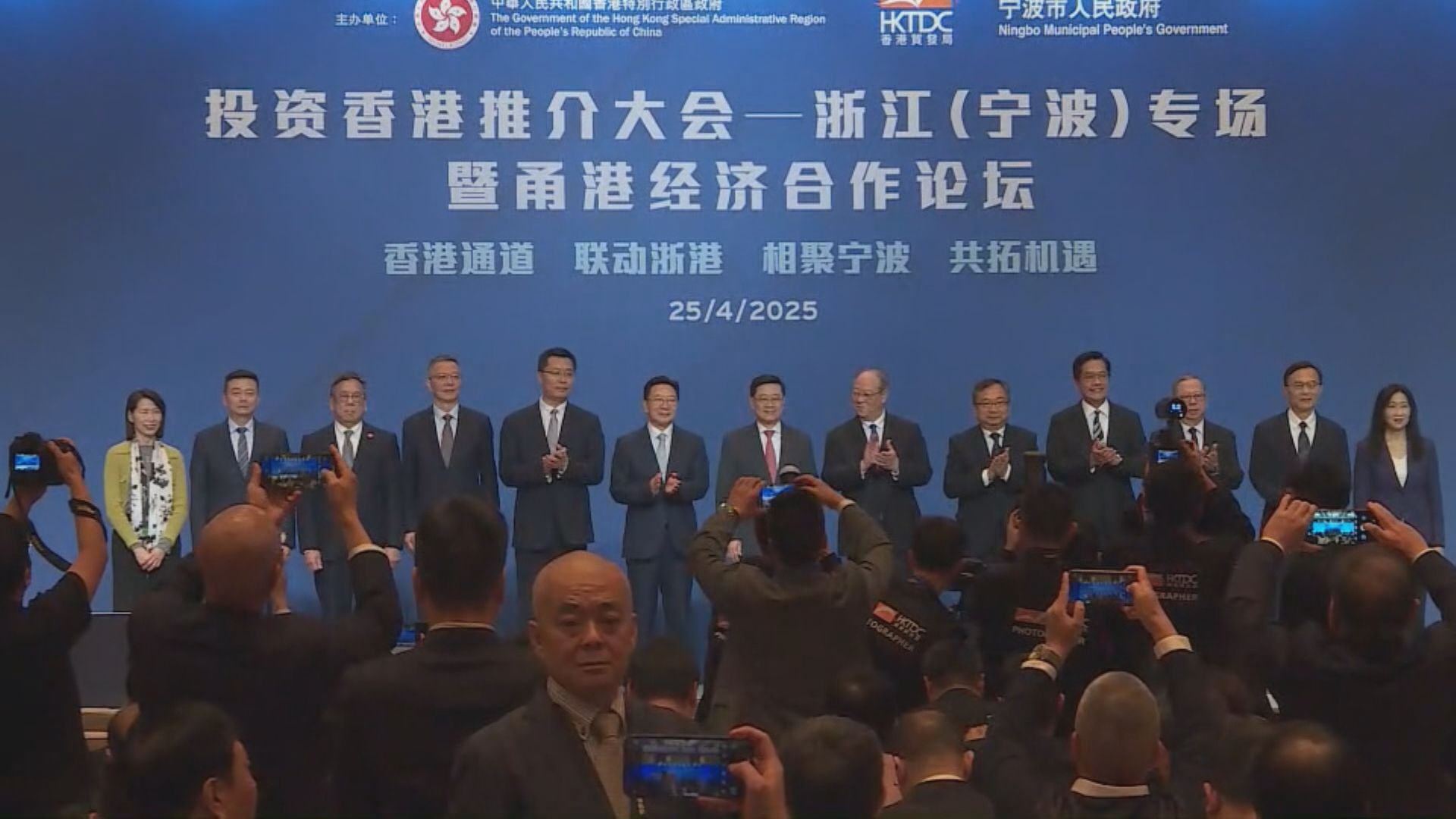 李家超說:「最近美國霸凌濫施關稅單邊主義抬頭,全球格局、地緣政治風雲變色,為環球經濟帶來破壞及衰退風險,志不立,天下無可成之事,只要我們堅定意志,共同努力,甬港必能讓東海浪與香江潮,共奏豐盛華章。」