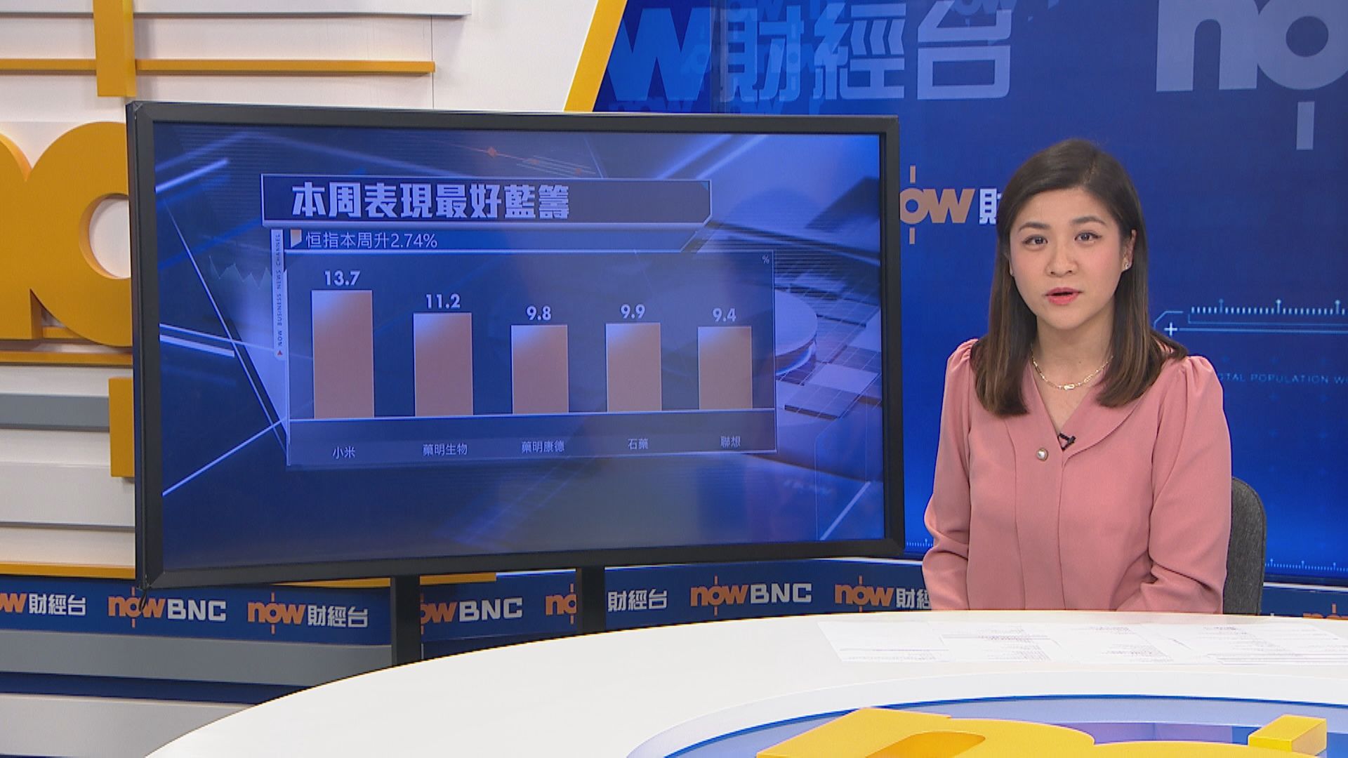 本周表現最佳藍籌,依次為小米集團(01810)升13.7%、藥明生物(02269)升11.2%、藥明康德(02359)升9.8%、聯想集團(00992)升9.9%、石藥集團(01093)升9.4%。