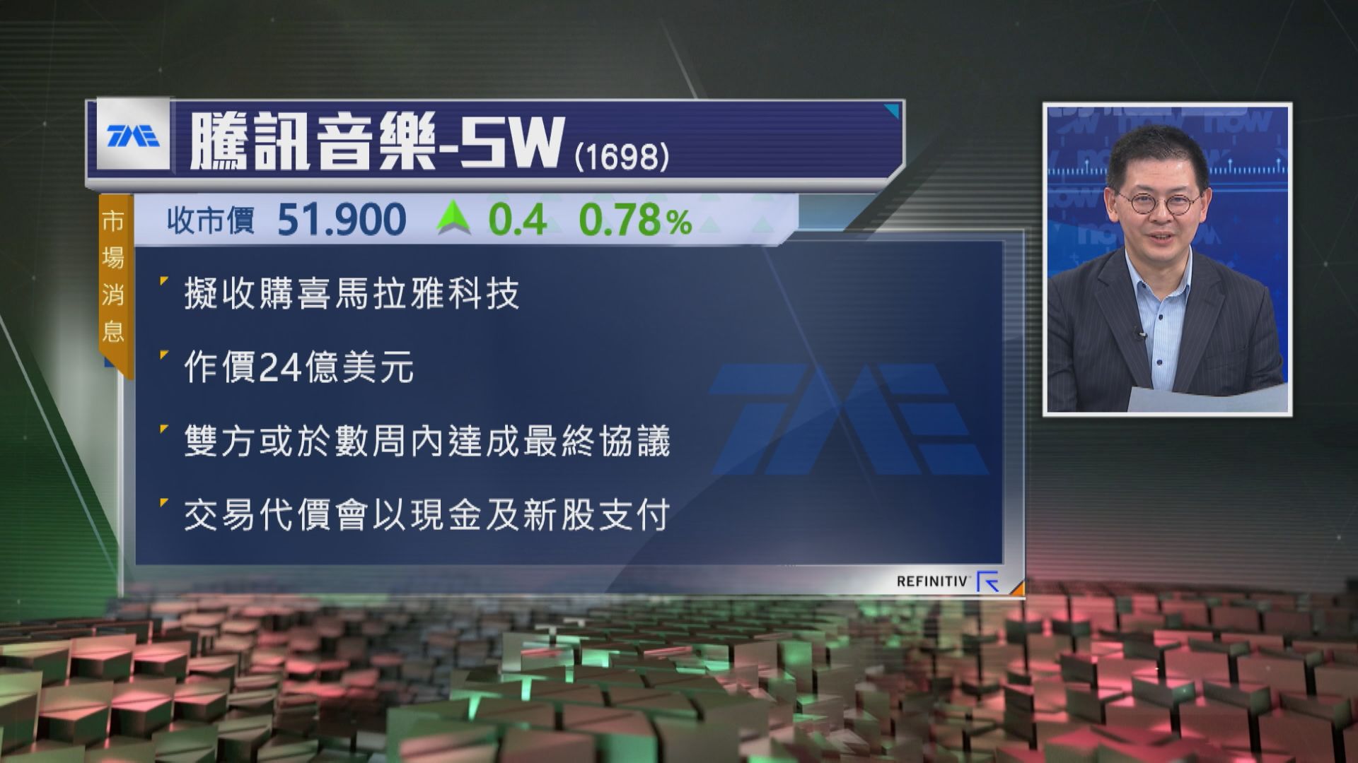 【Now財經台】市場消息指,騰訊音樂(01698)擬斥資24億美元,收購在線音頻平台喜馬拉雅科技,作價會以現金及新股支付。