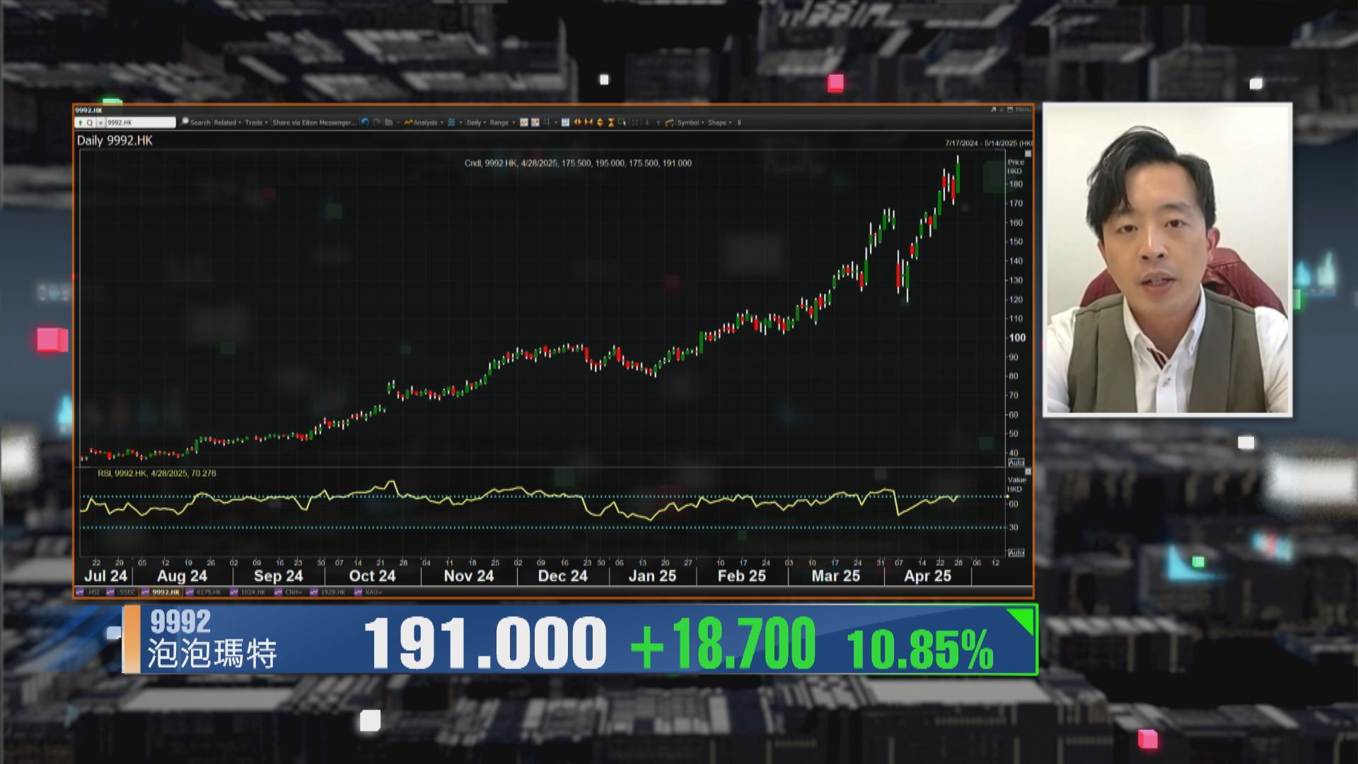 Stevan認為,泡泡瑪等的股價强勢會持續,但現水平不算一個太好的買入點;若股價其後能回調到10天線或20天線,相信會是較好的支持位;較吸引的買入價為160元至165元左右。