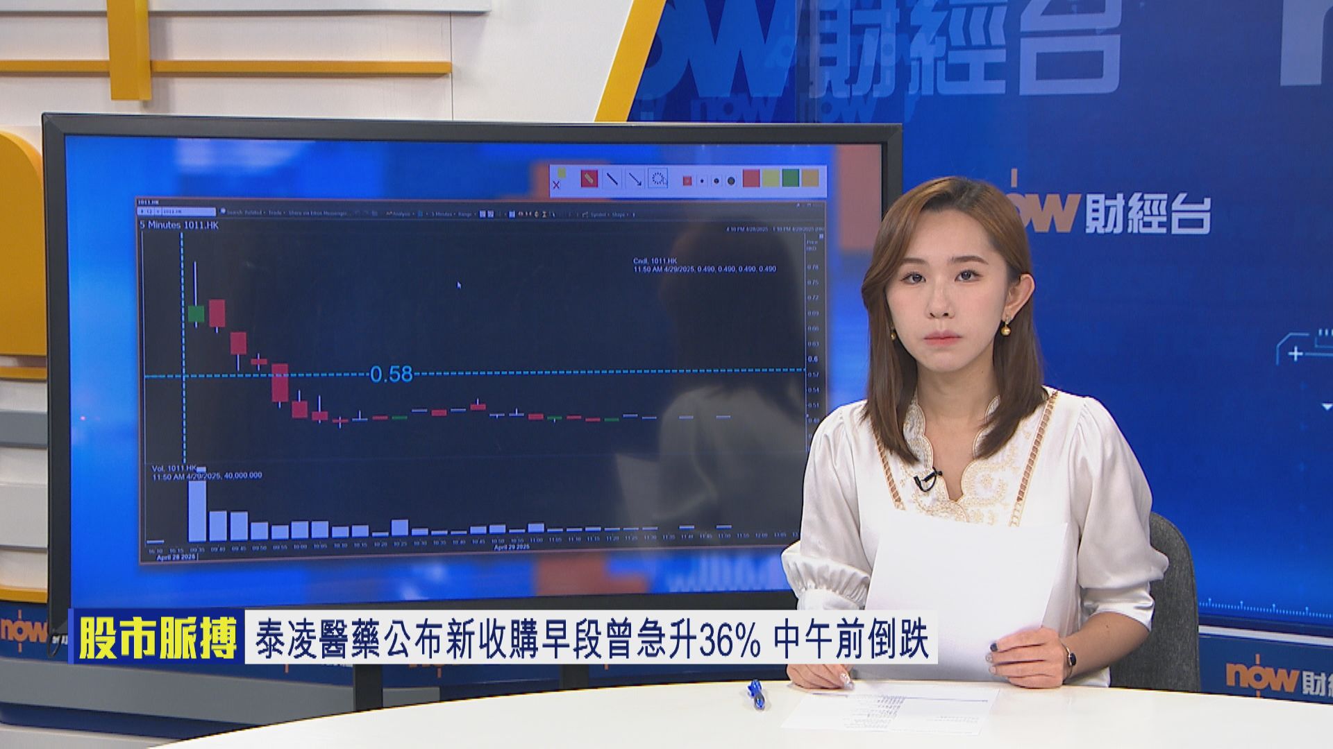【Now財經台】日前公布新收購嘅毫子股泰凌醫藥(01011),股價今日(29日)高開逾13%後,升幅一度擴大至36%,高見0.79元,衝上半年高位,其後升幅逐步收窄,中午前更倒跌,成交股數較過去100日平均激增約160倍。
