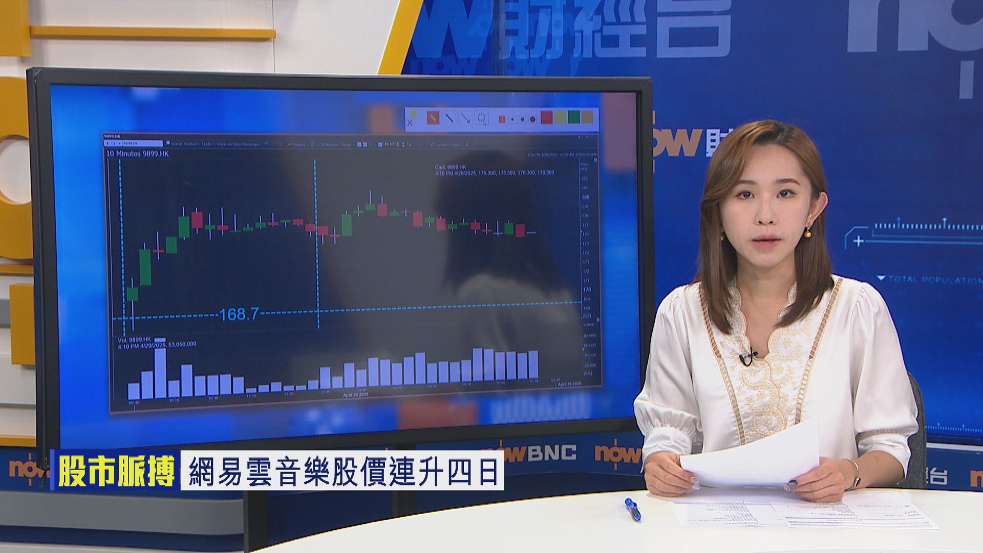 【Now財經台】網易雲音樂(09899)股價今早(29日)高開1%後,愈升愈有,午後一度高見181元,衝上3年半高位,收市升逾4%,報176.3元,連升第4個交易日,成交股數較過去100日同時段平均增1倍。