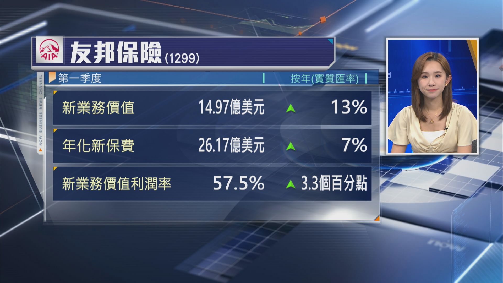 【Now財經台】友邦保險(01299)上季新業務價值按年增長13%。