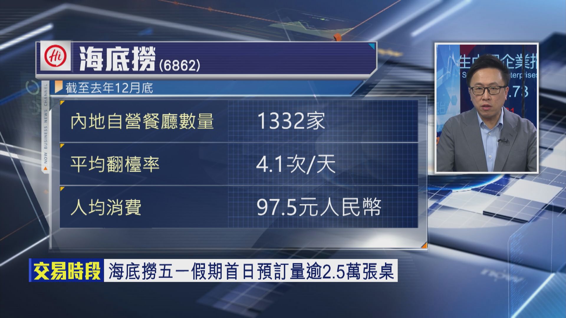 【Now財經台】「五一黃金周」快將展開,內地餐飲市場將迎來消費高峰,龍頭之一海底撈(06862)宣布,截至前日(28日)止,全國門店「五一」假期首日預訂量逾2.5萬張枱,集團喺「五一」嘅表現係咪值得憧憬?