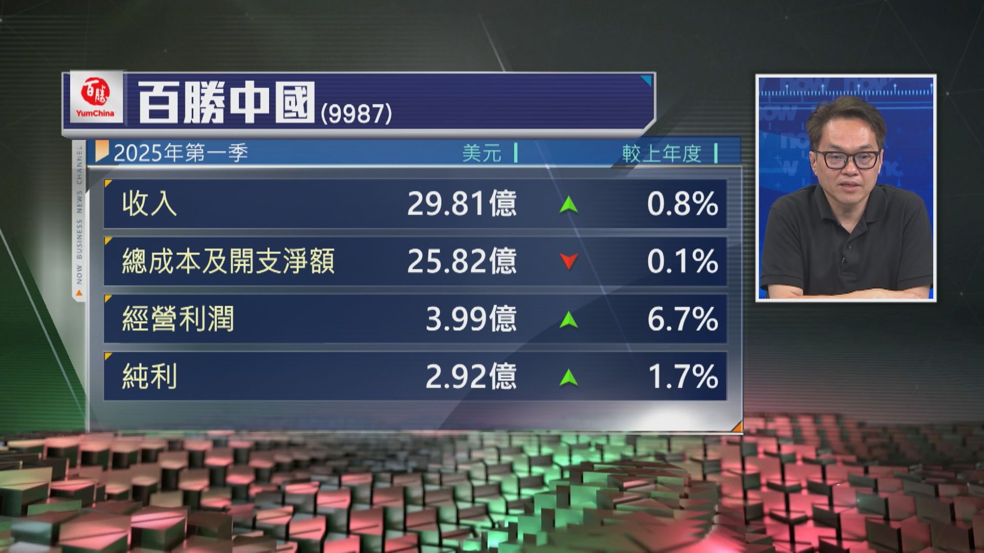 【Now財經台】百勝中國(09987)第一季收入升0.8%,純利升1.7%。