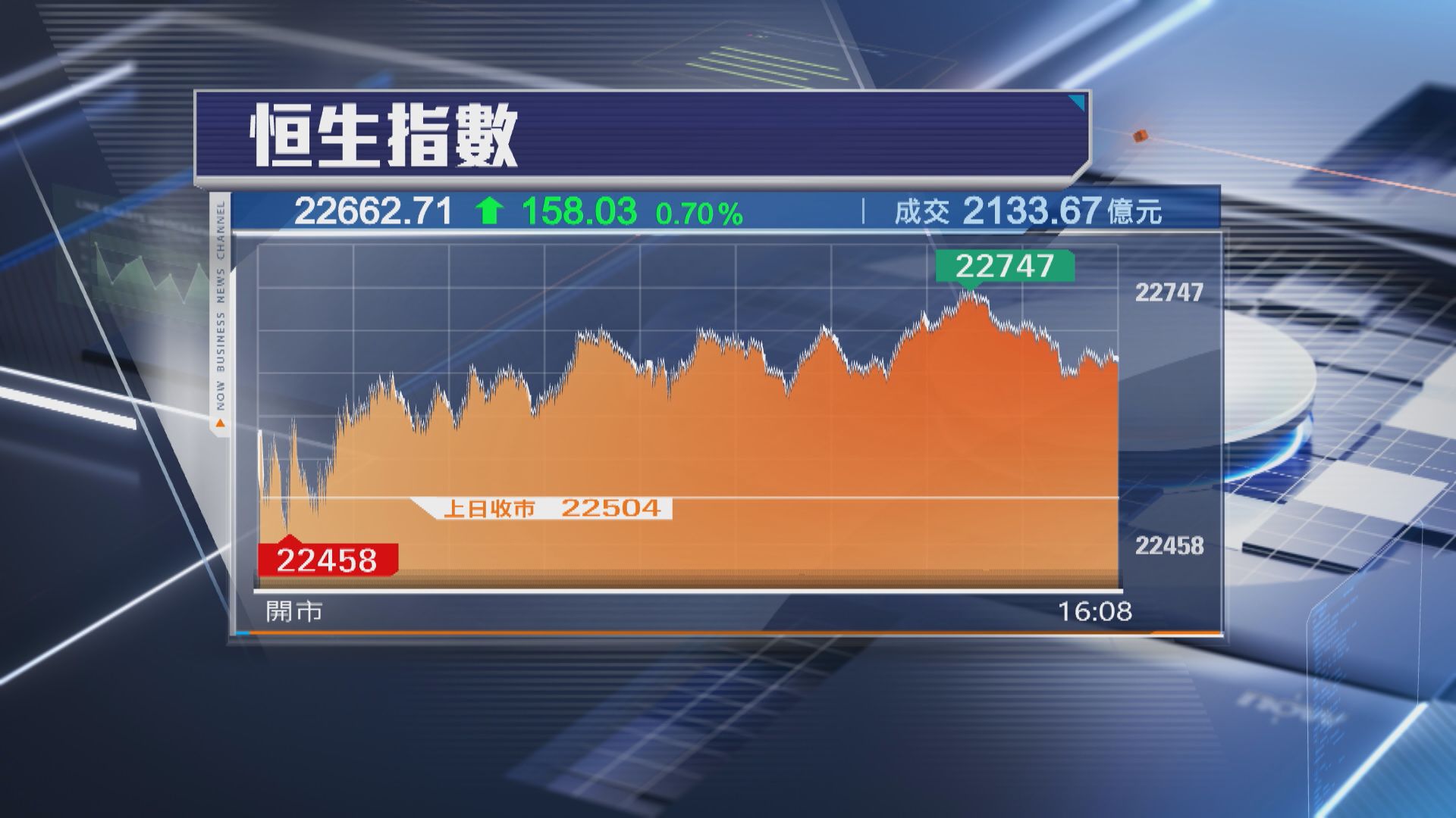大市今日(6日)高開71點後,早段一度好淡爭持,其後確立升勢,午後最多升242點,尾市升幅收窄,收市報22662點,升158點。北水「回歸」,大市全日成交增至逾2133億元。