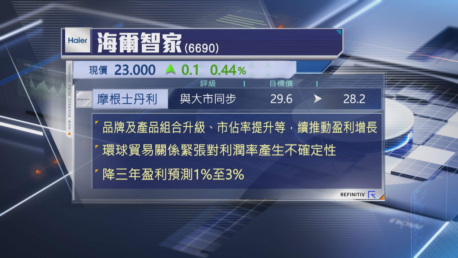【Now財經台】摩根士丹利下調海爾智家(06690)目標價近5%至28.2元,維持「與大市同步」,並指現價估值吸引。