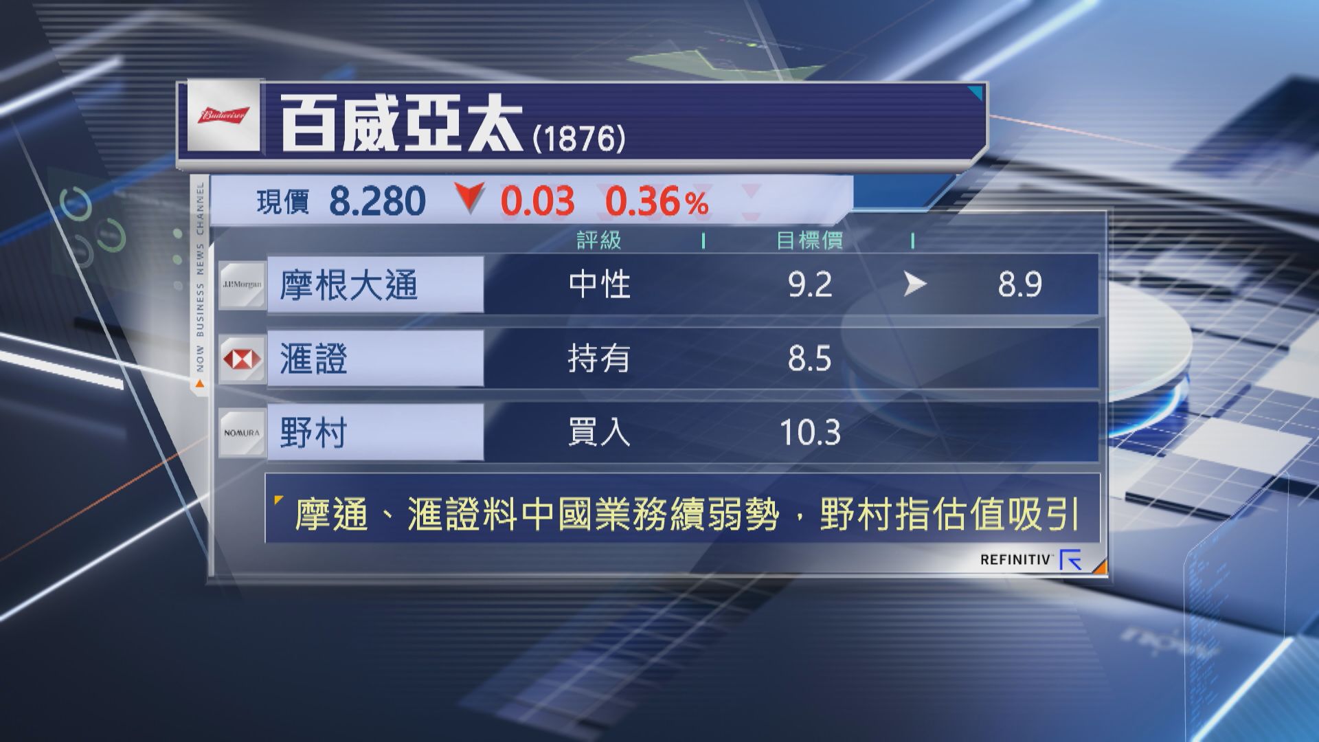【Now財經台】摩根大通下調百威亞太(01876)目標價,由9.2元降至8.9元,維持「中性」評級。