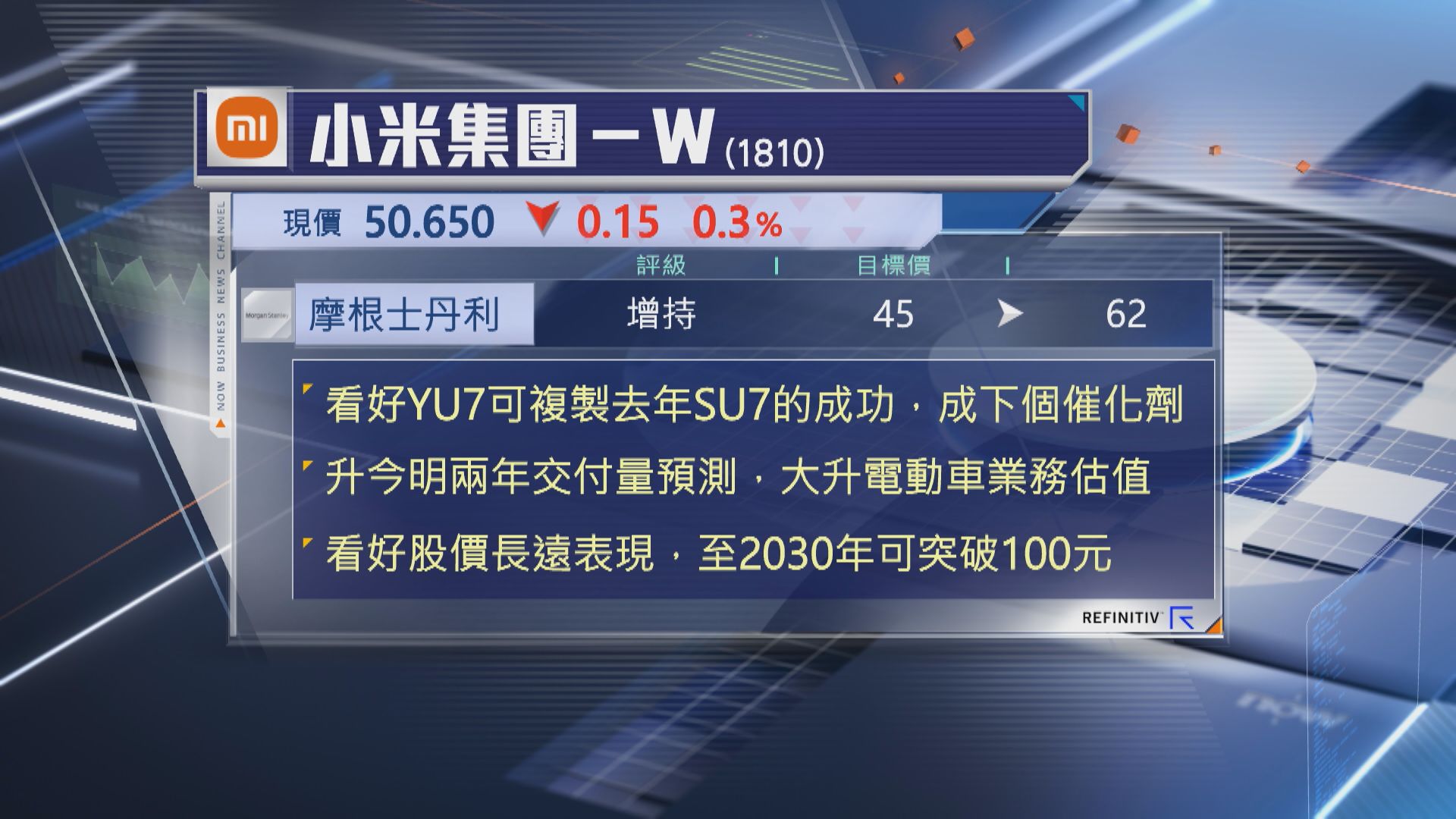 【Now財經台】摩根士丹利及滙豐證券均看好小米集團(01810)快將公布的新車YU7,將會是下一個催化劑,並上調目標價。
