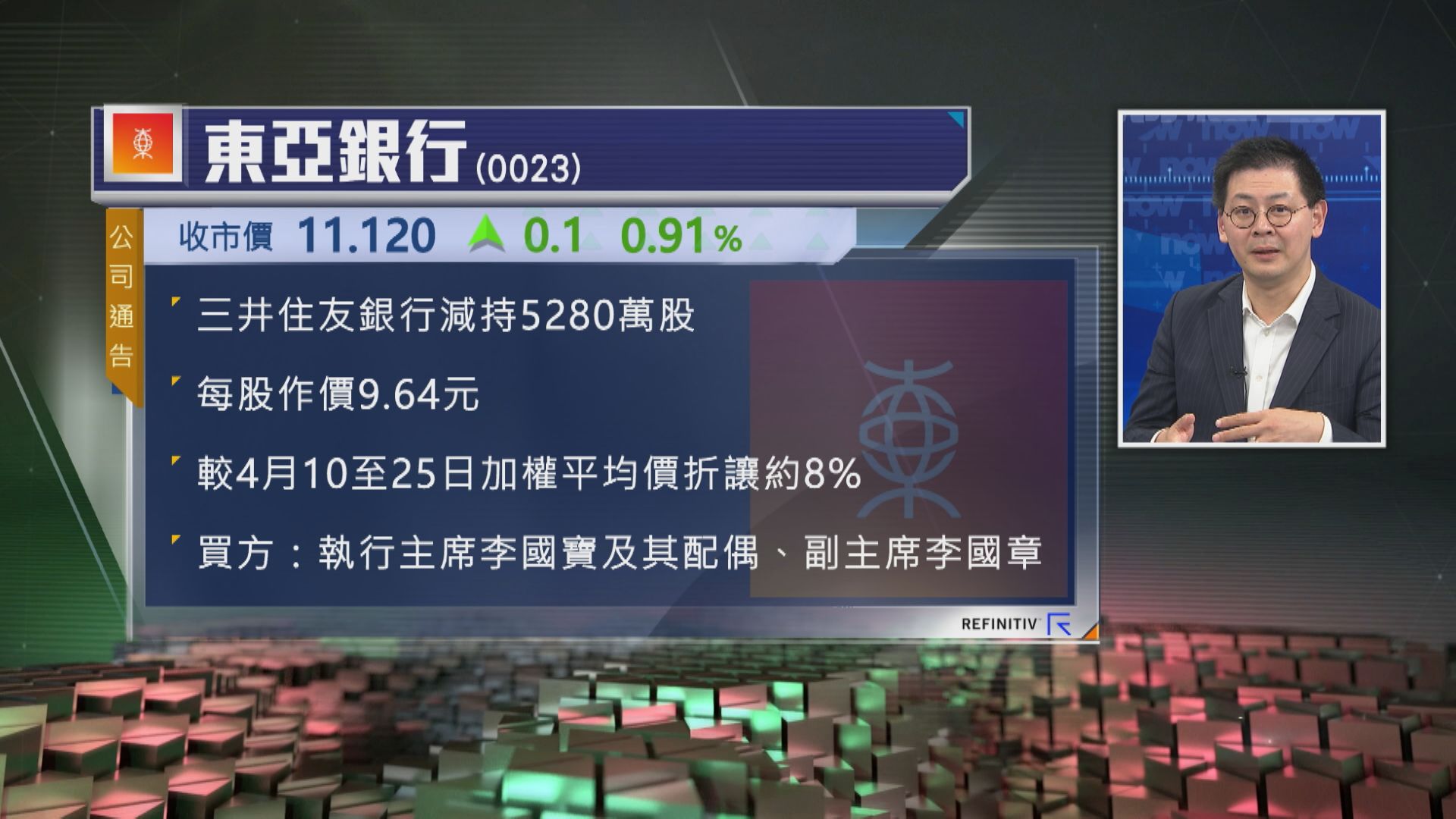 耀才證券研究部總監植耀輝表示,三井住友減持只是要符合2015年認購股份的協議,即持股不超過20%水平,相信跟東亞業務前景無關,消息對股價影響中性。