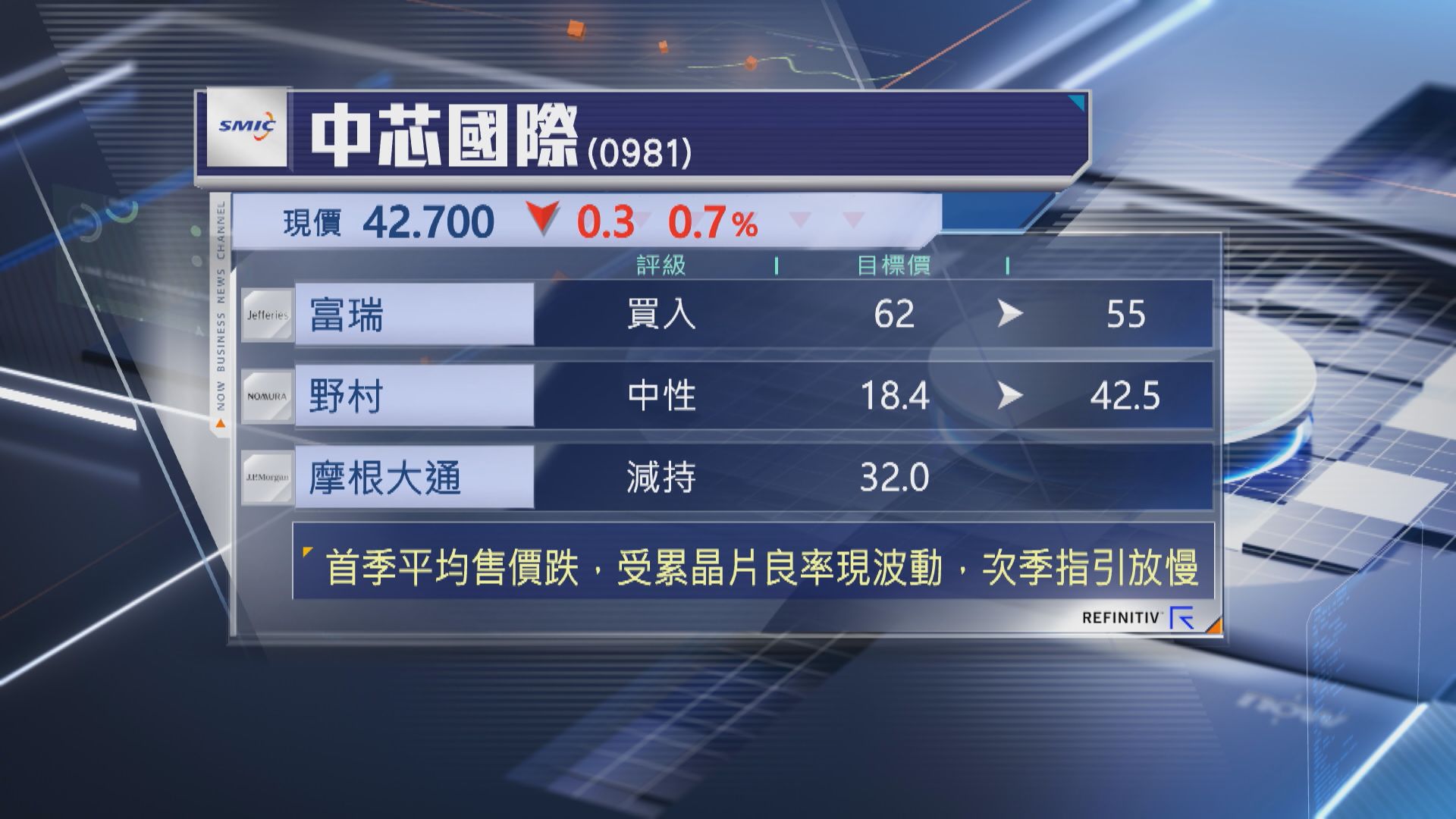 【Now財經台】中芯國際(00981)公布首季業績後,券商對集團看法分歧,其中,富瑞集團下調中芯目標價,不過,野村大幅調高目標價。