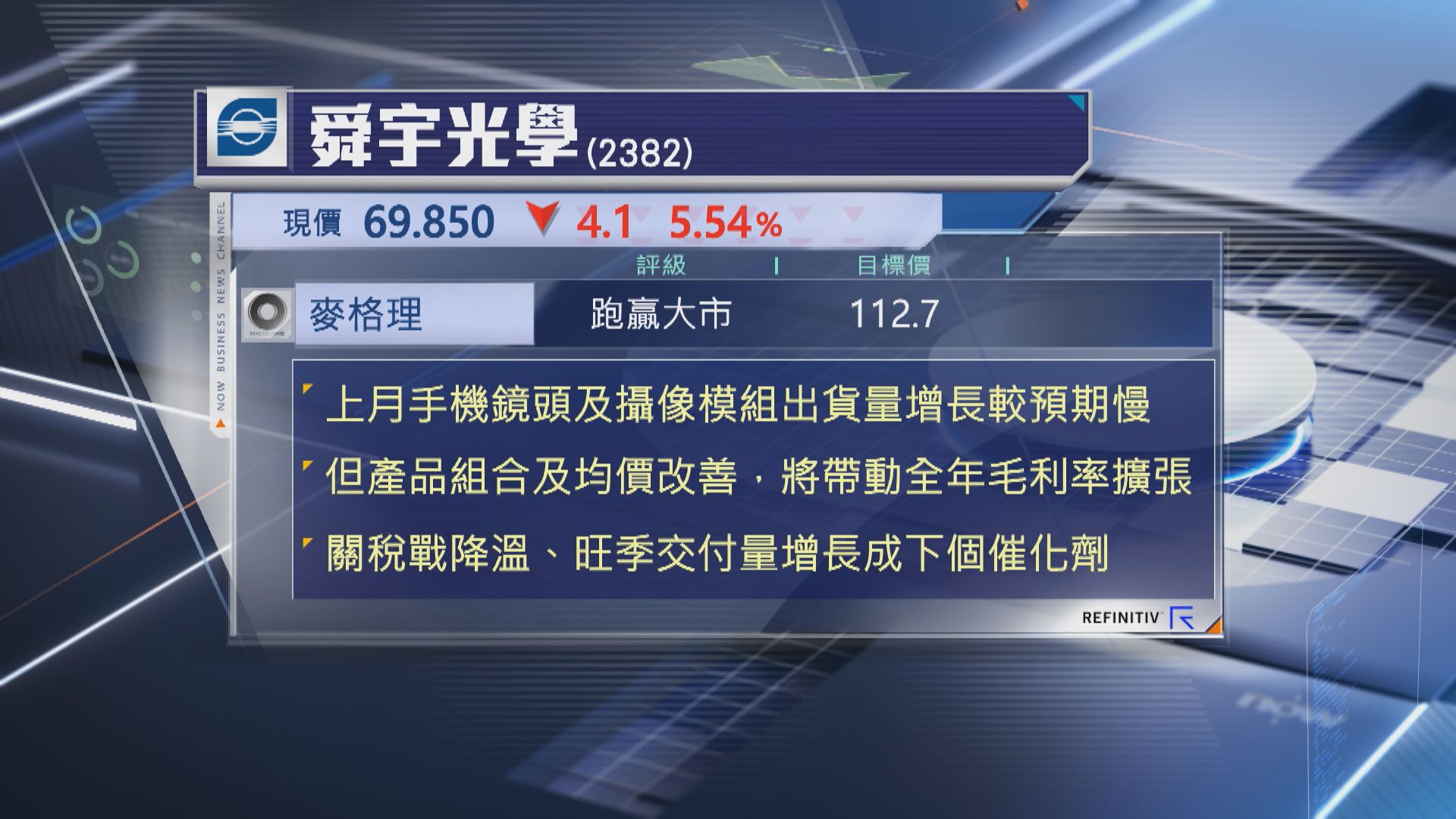 【Now財經台】麥格理表示,舜宇光學科技(02382)4月手機鏡頭及攝像模組出貨量增速遜預期。