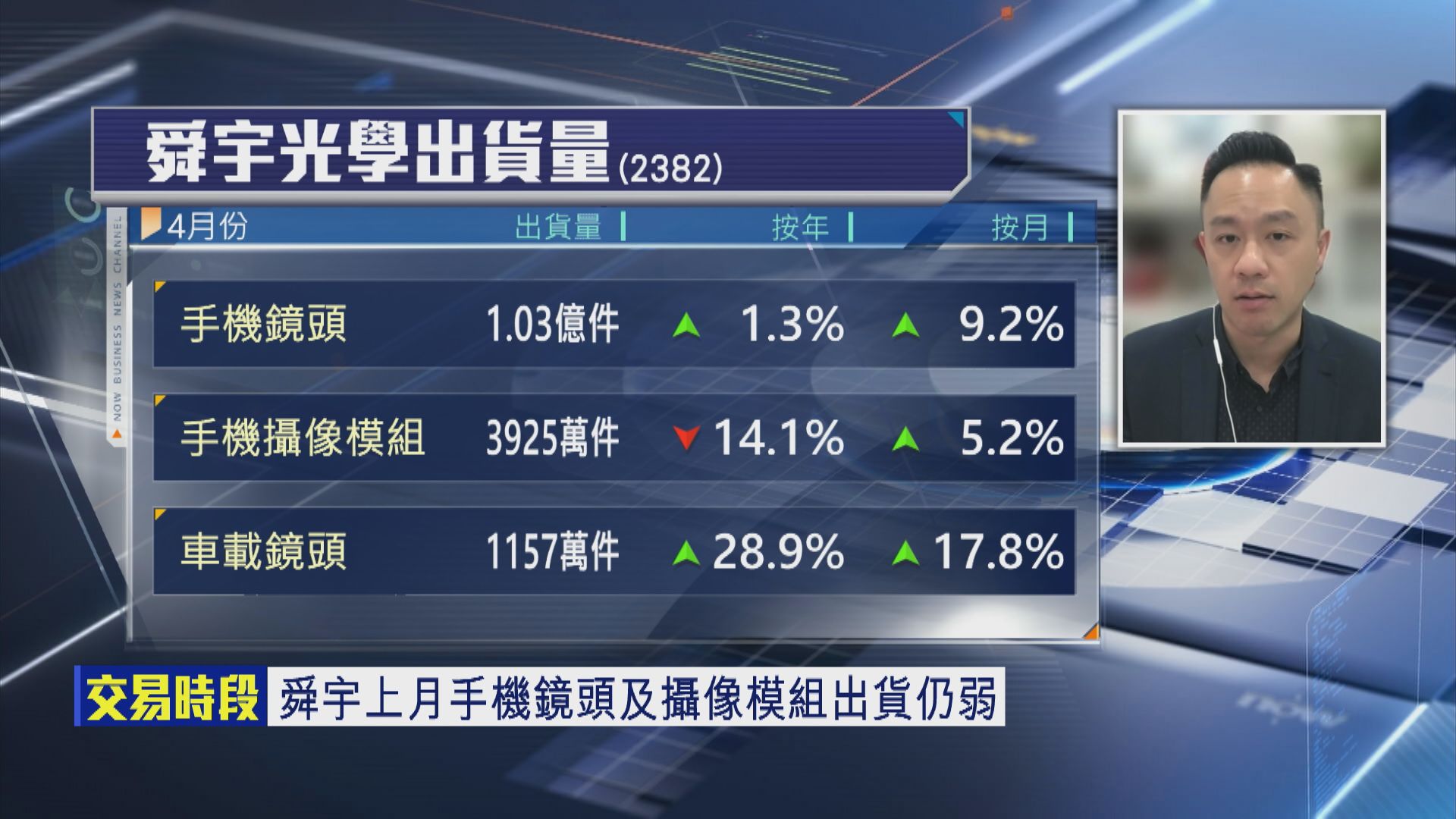 【Now財經台】舜宇光學科技(02382)昨日(12日)出咗4月營運數據,手機鏡頭出貨量逾1億件,按年增長1.3%,按月增長9.2%,手機攝像模組出貨量按年跌14%,按月則增長5.2%,至於車載鏡頭按年及按月繼續錄得雙位數增長,點評估未來嘅出貨量走勢?