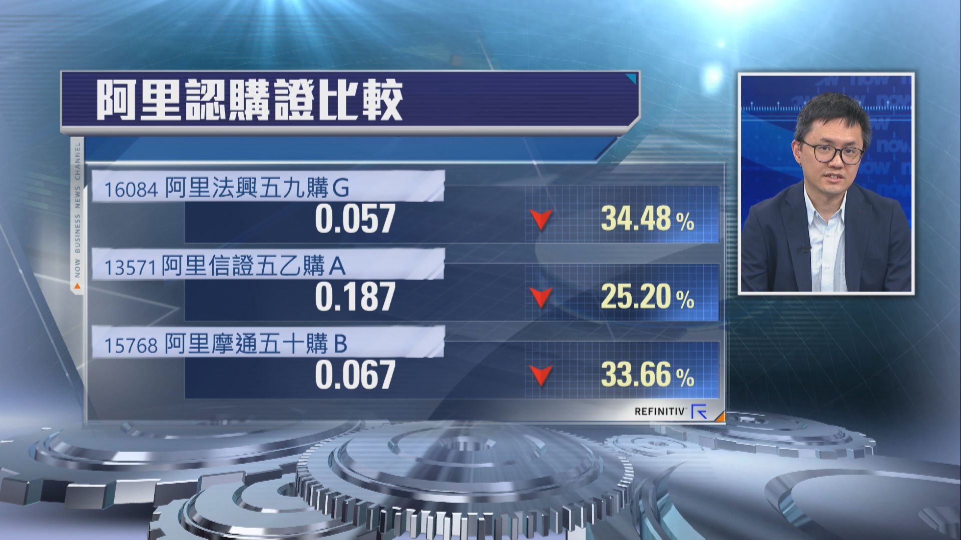 【Now財經台】阿里巴巴(09988)昨日(15日)派咗季度成績表,上季經調整多賺22%,差過預期,繼美國ADS昨晚(15日)大跌後,香港股價今早(16日)都跟跌,一度大跌逾6%,低見120.3元。市場上嘅熱門CALL,行使價145元至147元,價外18%至19%,槓桿做到5倍至6倍,如果部署呢批CALL有咩要留意?