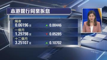 隔夜拆息連升第2日,報約0.061厘,不過,1個月拆息未有跟升,跌52點子,報約1.29厘,1年期拆息報約3.25厘。