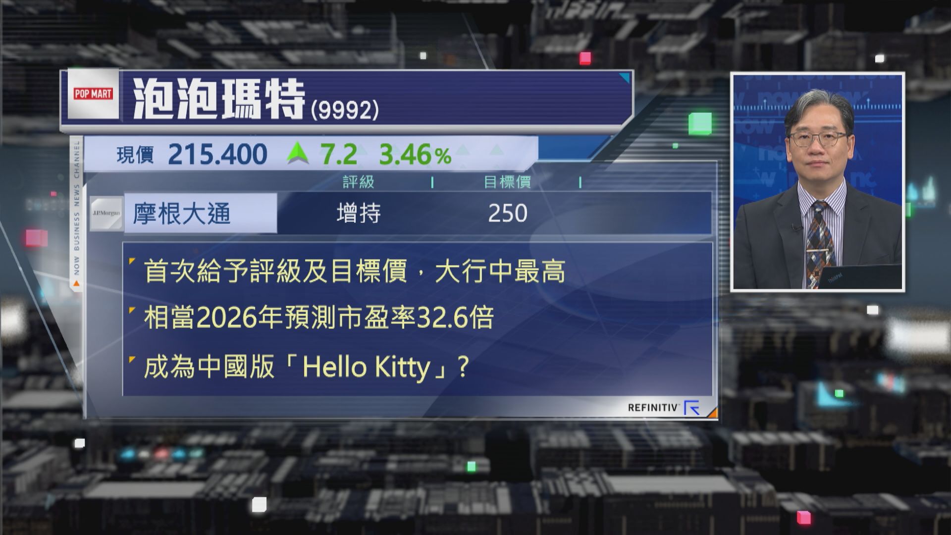 泡泡瑪特股價連日破頂,今日(21日)一度再升逾5%,高見220元,摩根大通最新首次給予泡泡250元目標,係咁多家大行之中睇得最牛,2026年預測市盈率(PE)32.6倍,係咪集團未來增長好勁?市場認為,泡泡瑪特旗下「吸金王」Labubu有機會成為「中國版Hello Kitty」,即係成為一個長賣長有嘅長青產品,係咪值得憧憬?