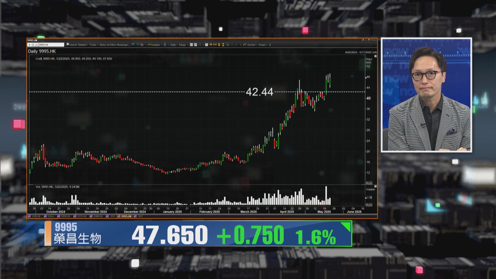 Jaseper又指,雖然榮昌仲蝕緊錢,但虧損已經收窄,而集團喺免疫、腫瘤方面亦有自家技術,集團股價由3月約14元起步,升到今日即市高位49.5元,已累升逾2.5倍,反映資金逐步睇好呢個板塊,所以配股消息對榮昌嚟講唔係負面,公司只係正常利用資本市場作用發展業務。