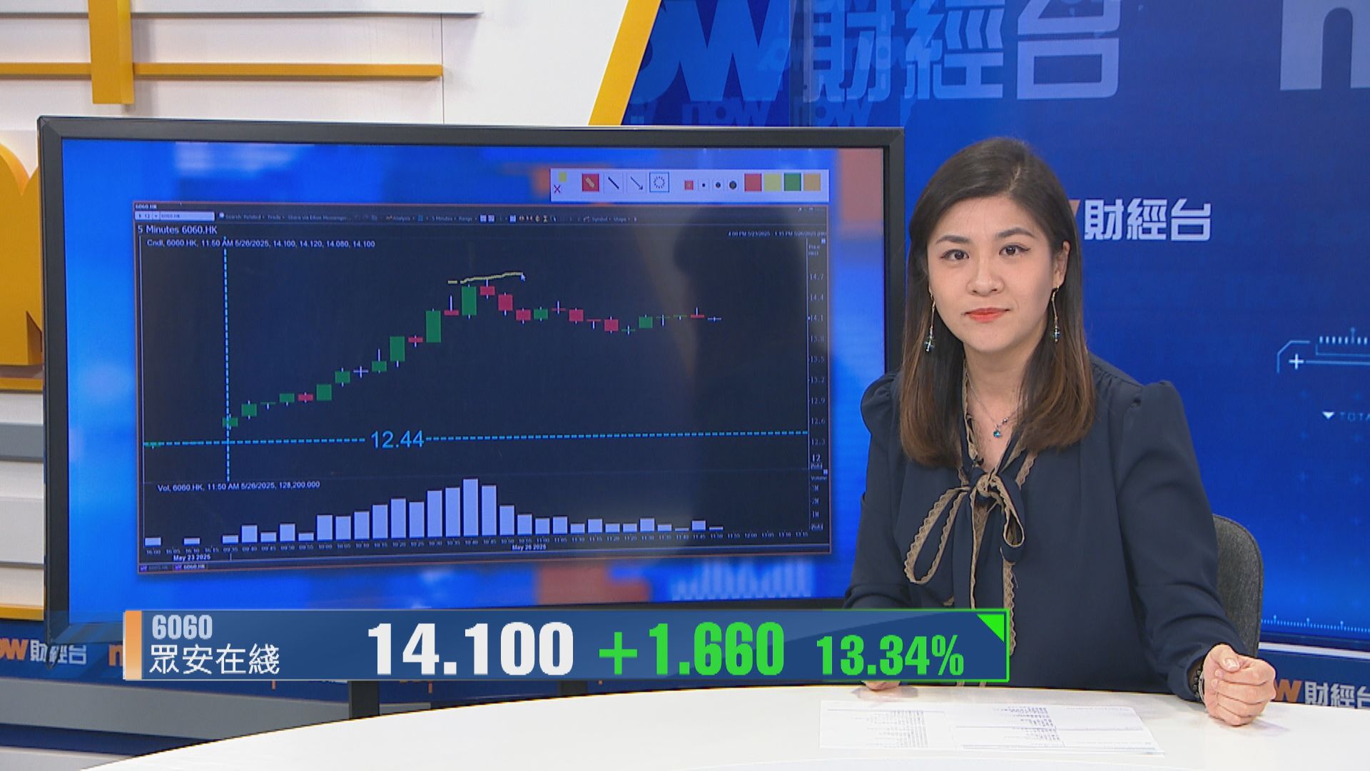 【Now財經台】互聯網保險公司眾安在線(06060)今早(26日)高開逾1%後,買盤隨即湧入,股價一度勁升18%,高見14.68元,衝上1個月高位,截至中午止,成交金額逾6億元,成交股數較過去100日同時段平均大增7倍。