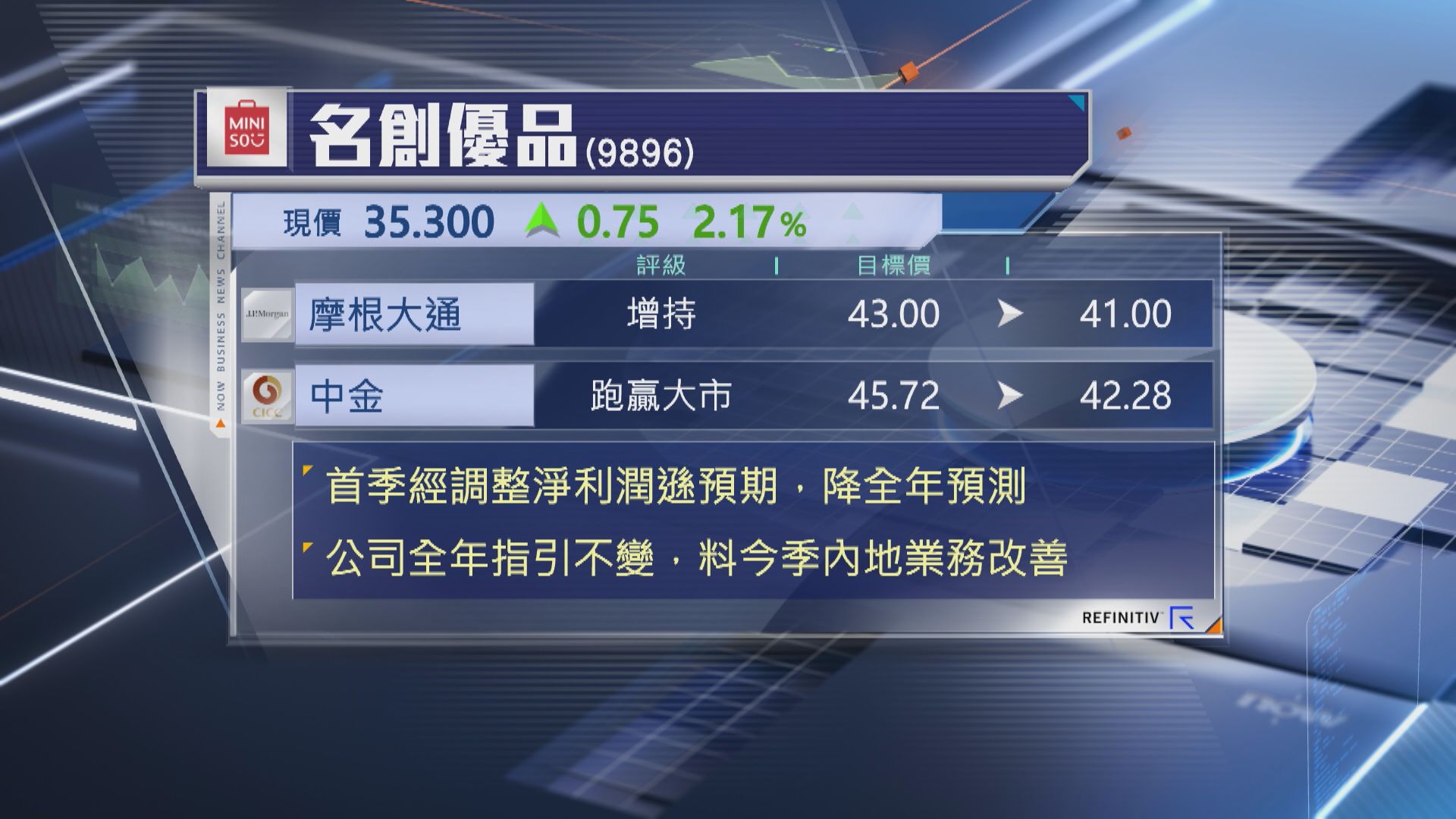 此外,名創維持全年業績指引,摩通及中金均看好在「五一黃金周」長假期支持下,名創今季內地業務將有改善。