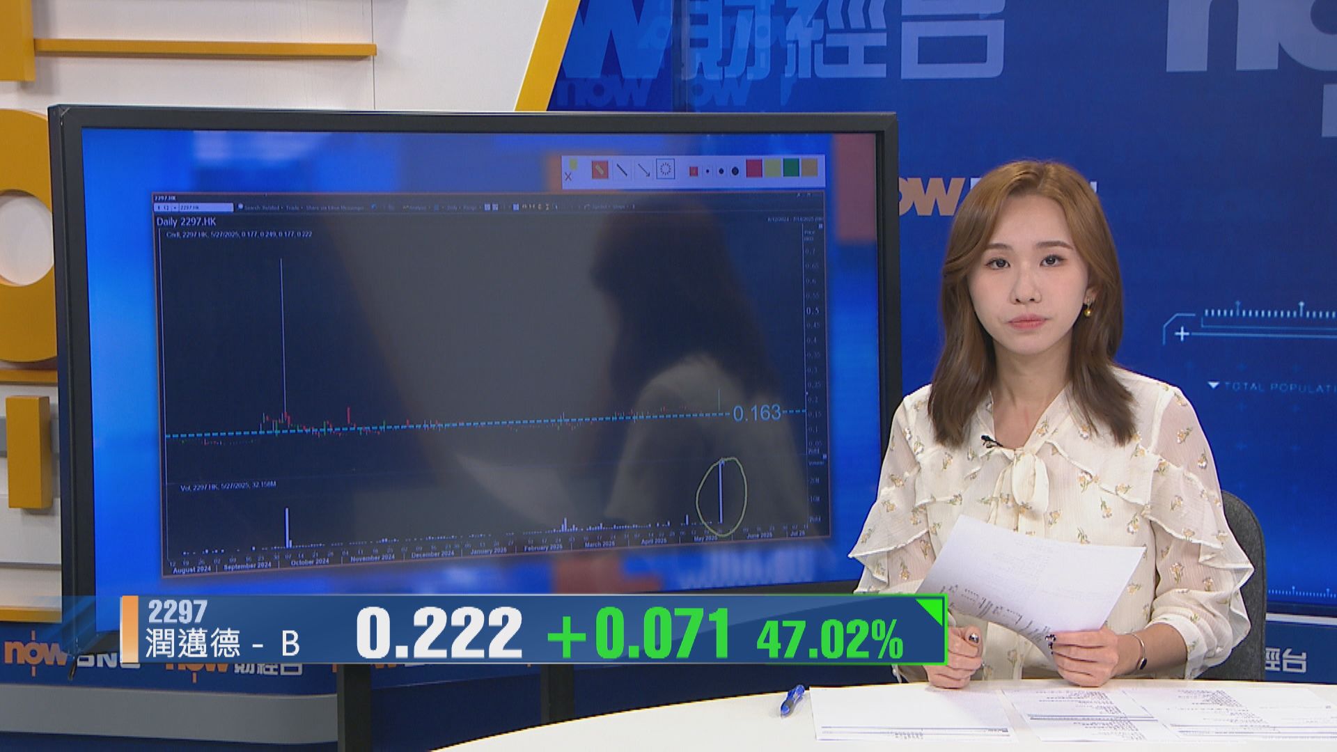 【Now財經台】B仔股潤邁德(02297)高開17%,愈升愈有,尾市衝高升近65%,高見0.249元,見7個月高位,收市升47%,報0.222元,成交金額約700萬元,但由於平時成交疏落,股數較過去100日同時段平均成交增加58倍。