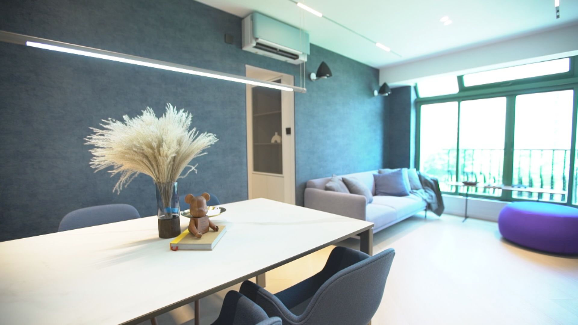 【Now財經台】身為設計師的屋主著重設計多於實用性,全屋以清新灰藍色做主調,傢俬選用較大膽設計,弧形配搭金屬材質,打營獨一無二家居風格。