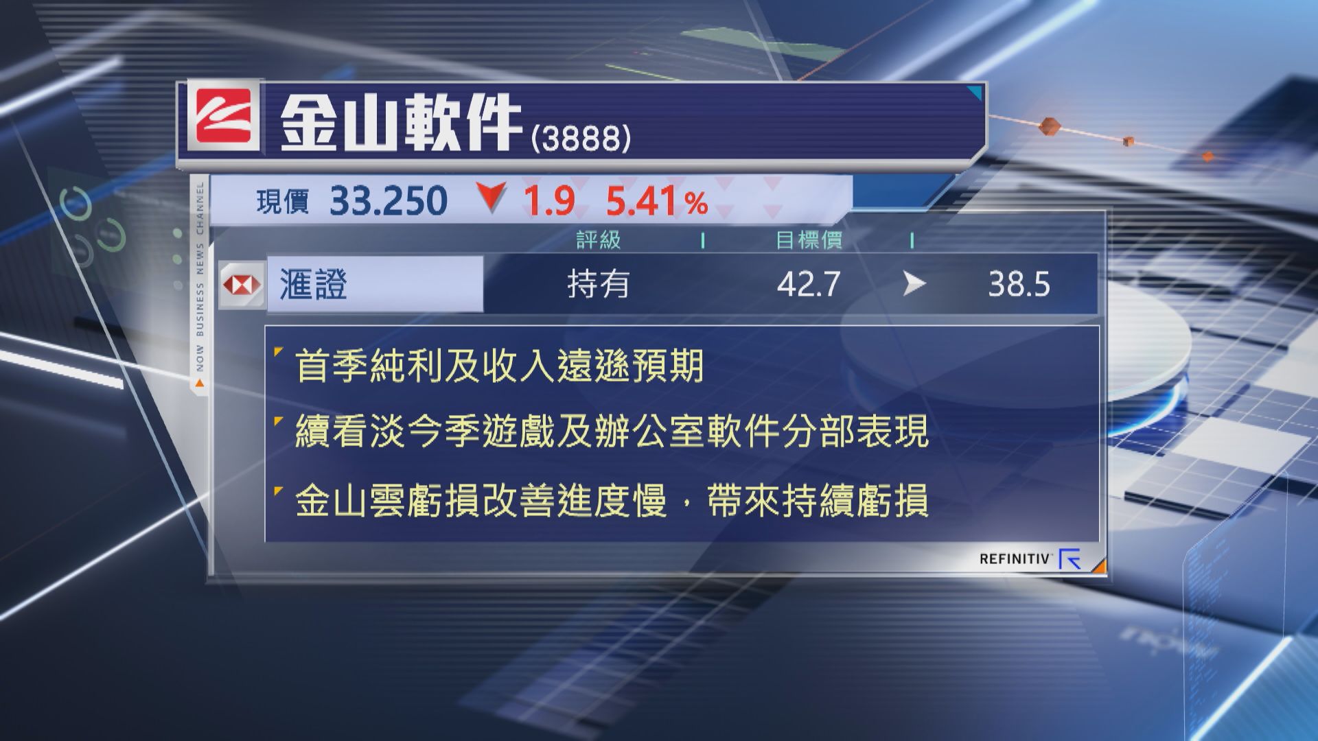 【Now財經台】滙豐證券下調金山軟件(03888)目標價近10%。